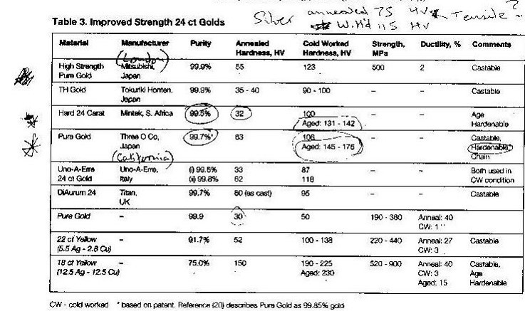 This table is taken from Pugh’s research folder, detailing ‘Improved Strength 24ct Gold’s’ from Chris Corti’s paper ‘Strong 24 carat golds: The metallurgy of micro-alloying’