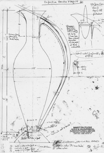 The design of the jug presented visually and technically critical points of construction e.g. the spinning of the body in two parts or three? the seam across the central body of the jug required an invisible water tight fit how would that be achieved when the alloy was a rich golden colour but no solders matched the colour, finish with such an unusually high content of gold how would the surface react?
