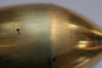 Finishing Trials, The ‘sticky’ nature of the alloy caused the lemel to clog files and mark the surface (similar to platinum), thus the use of emery paper with lubricants was necessary. Polishing the alloy with a mop produced a mottled surface with alternating areas of dull and high polish. The Ti appeared to create hard areas, which were accentuated when mop polishing removed the softer surrounding gold. Interestingly at the point of contact between mop and alloy surface the metal did not flow.