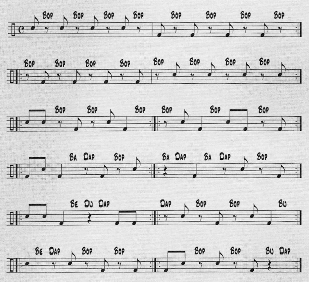 "Here's something inspired by blending Gary Chester's7 singing concept with Alan Dawson's8 approach to developing coordination. While playing the swing pattern with your ride cymbal and 2&4 with your hi-hat, play the written comping parts and sing the spaces. Use the syllabes written - they're the ones that horn players sing - and be sure to swing what you sing. The result will be that between your snare-drum, bass-drum and voice, all the 8th notes will be "played". This exercise will help you feel the spaces between the notes and make your phrases lay better. It will also help correct rushing problems. Start at quarter note=70 bpm."
