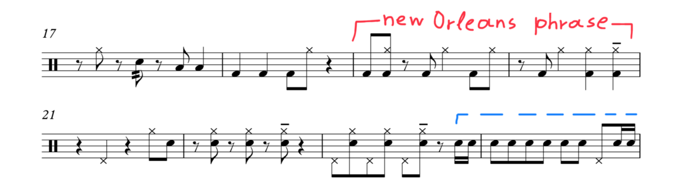 The way Jack is using exclusively the snaredrum (in bars 24-29) and the phrase with the bass-drum and the chocked cymbal (in bars 19-20) make me believe that he had New Orlean drumming in his mind while playing.