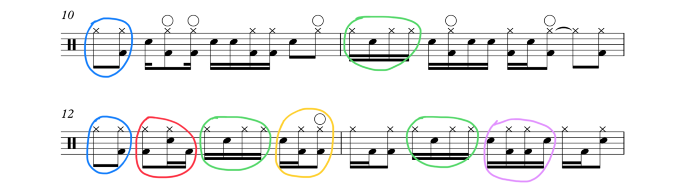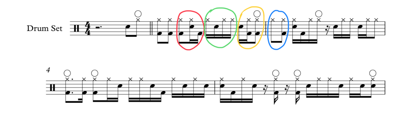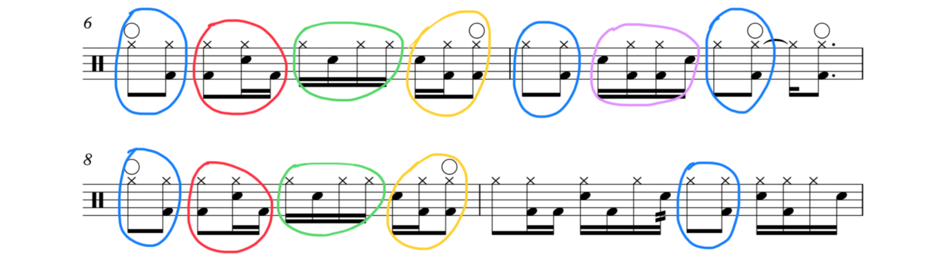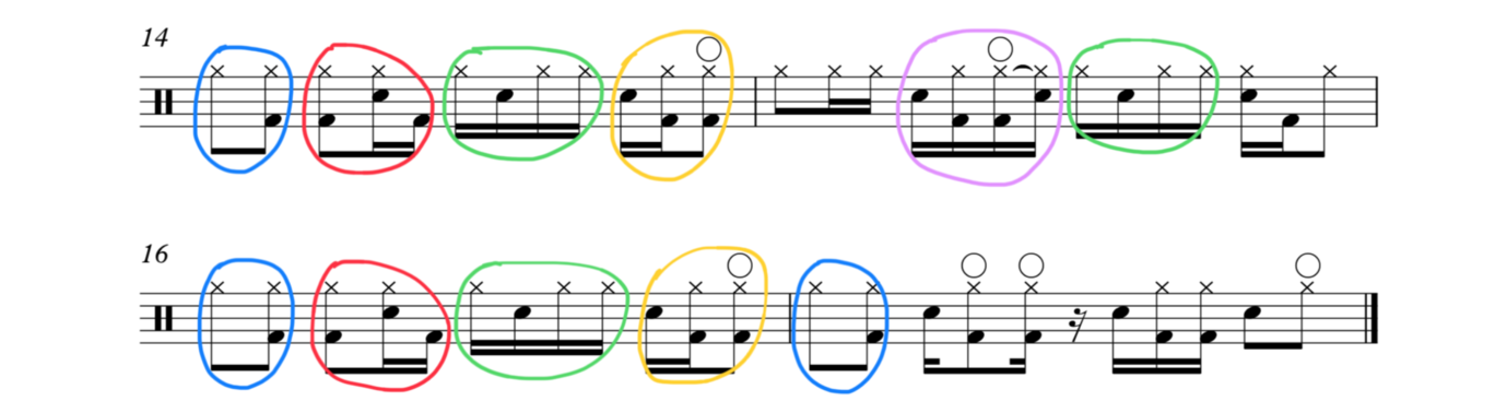 It’s so amazing how this beat constantly changes without losing its intergity and flow. After analyzing the transcription, we see that actually there are 5 motives which are repeated several times throughout the first 16 bars and there are other motives which appear just once. Take a look at the transcription. I marked each little phrase using a different colour.