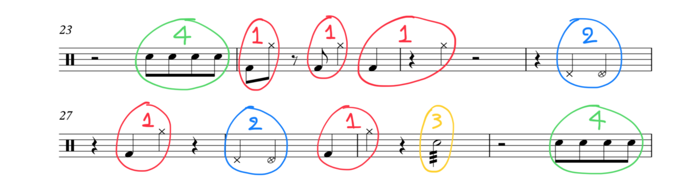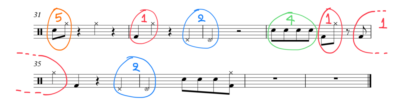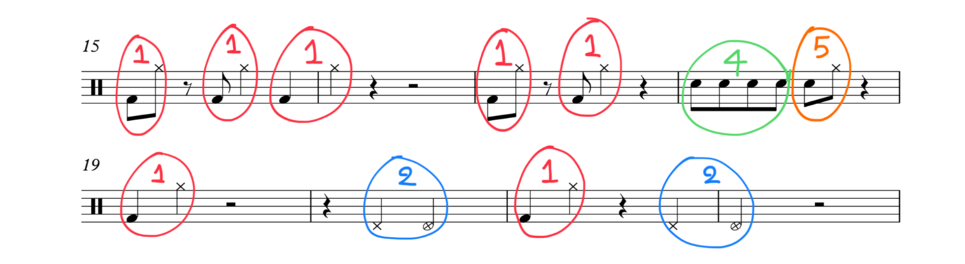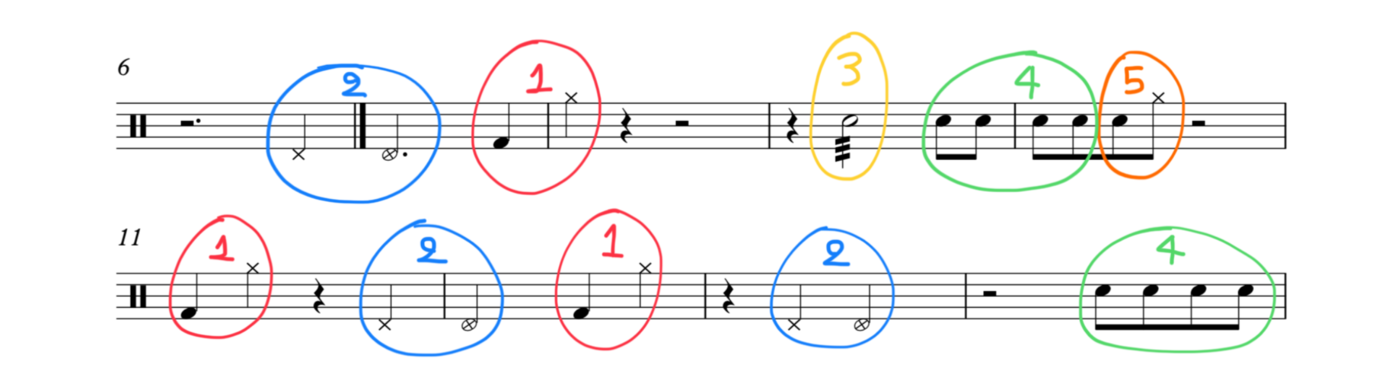 While practicing these 'unconventional styles of comping I found myself not having enough ideas to improvise with. However, by analyzing the drum-groove of 'actual proof' I found out that actually there are only 5 motives which are repeated several times throughout the first 16 bars. So, I created this 'limitation exercise' which forced me to create a comping using only 5 short figures.