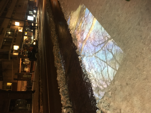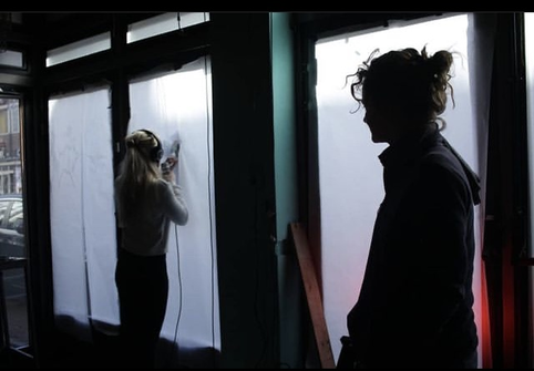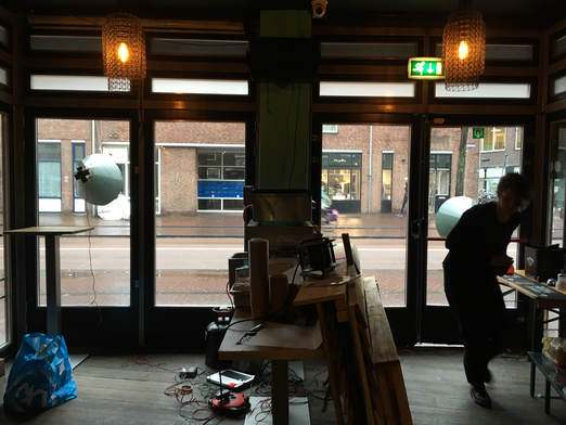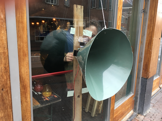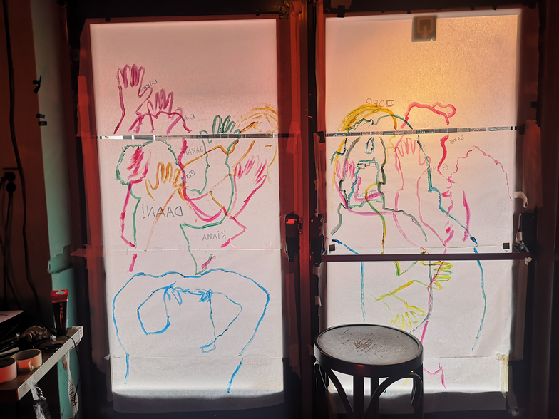Where we blending in the overall view to much? Nobody really took the time to watch or listen to the story, and if they did, we wouldn't have seen it as clear as we wanted. We coudn't react on it. The experiment was good to explore our possibilities of the space but was not interesting enough to go further with. Working on this visual limited us in time, the evening curvue of 9 p.m and the sunset which came later and later blocked us, we made ourselves visible but that was not the aim. We were looking for interaction.