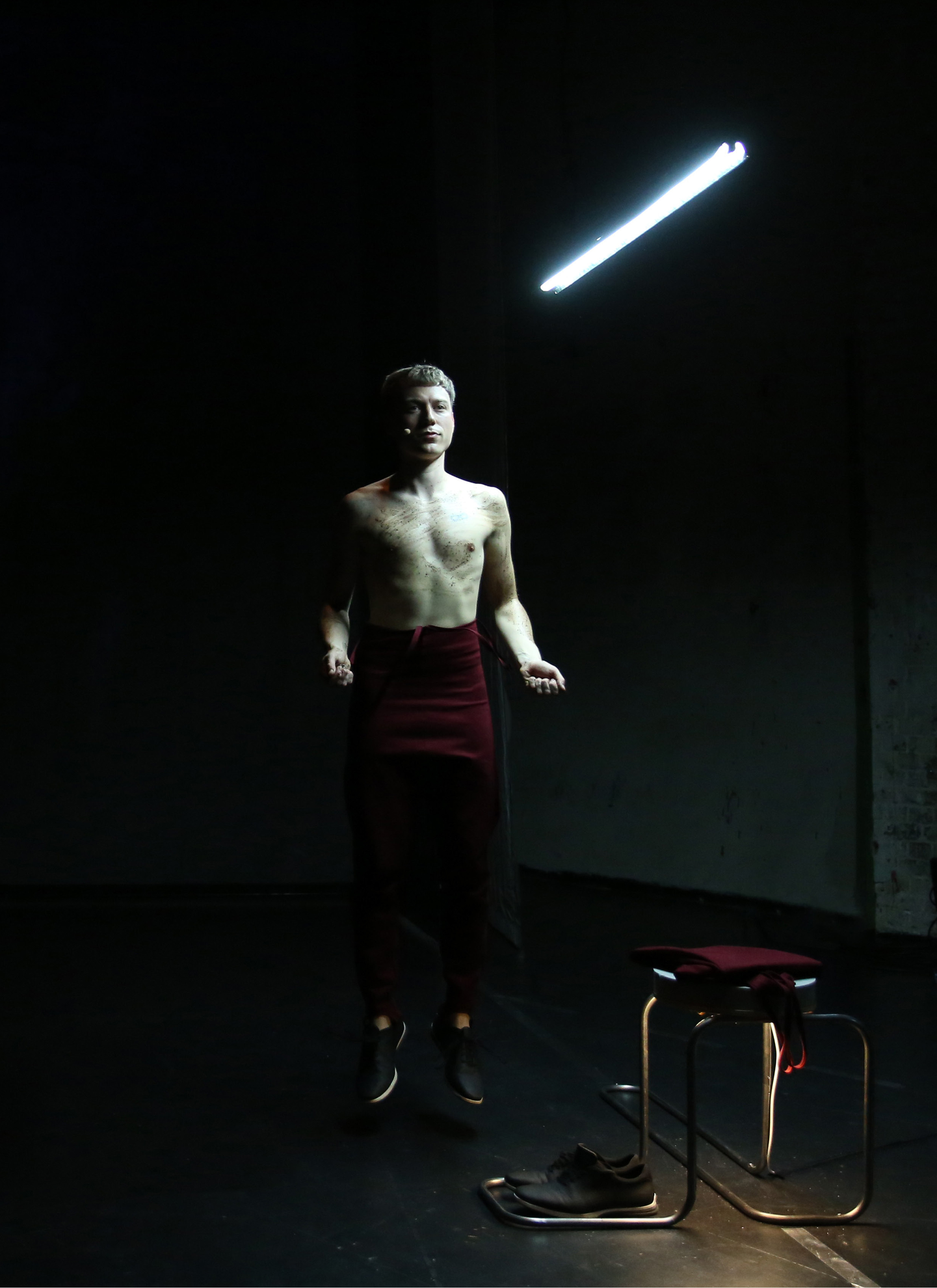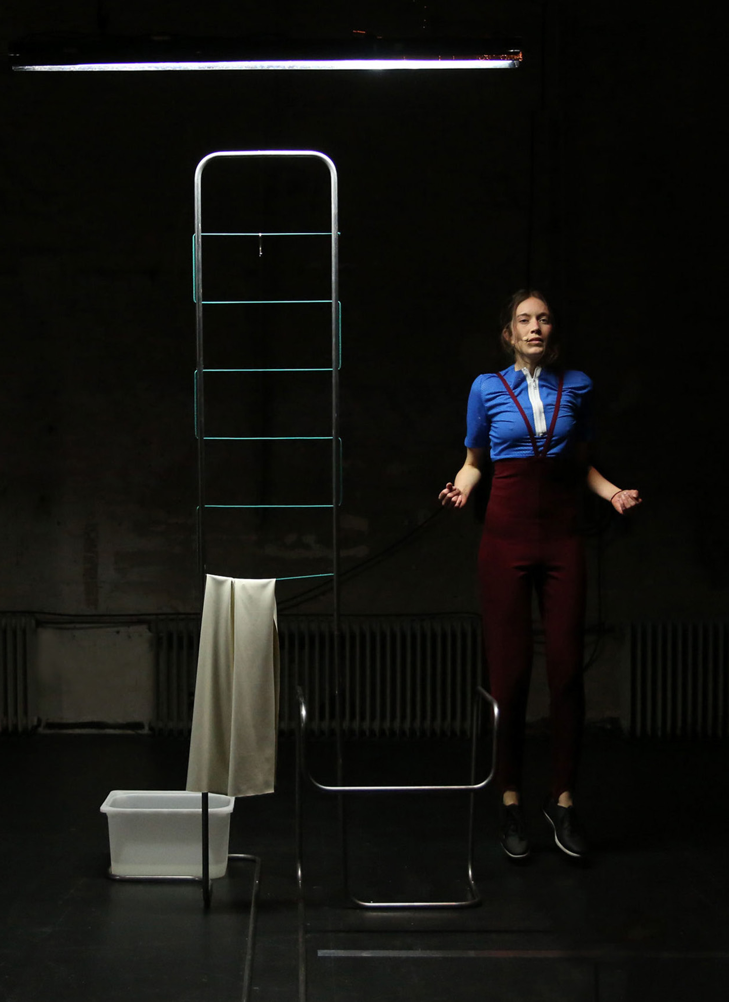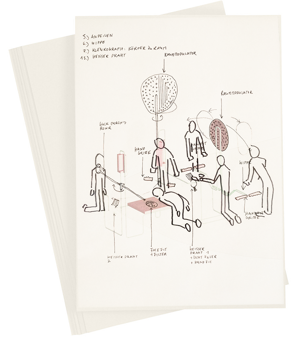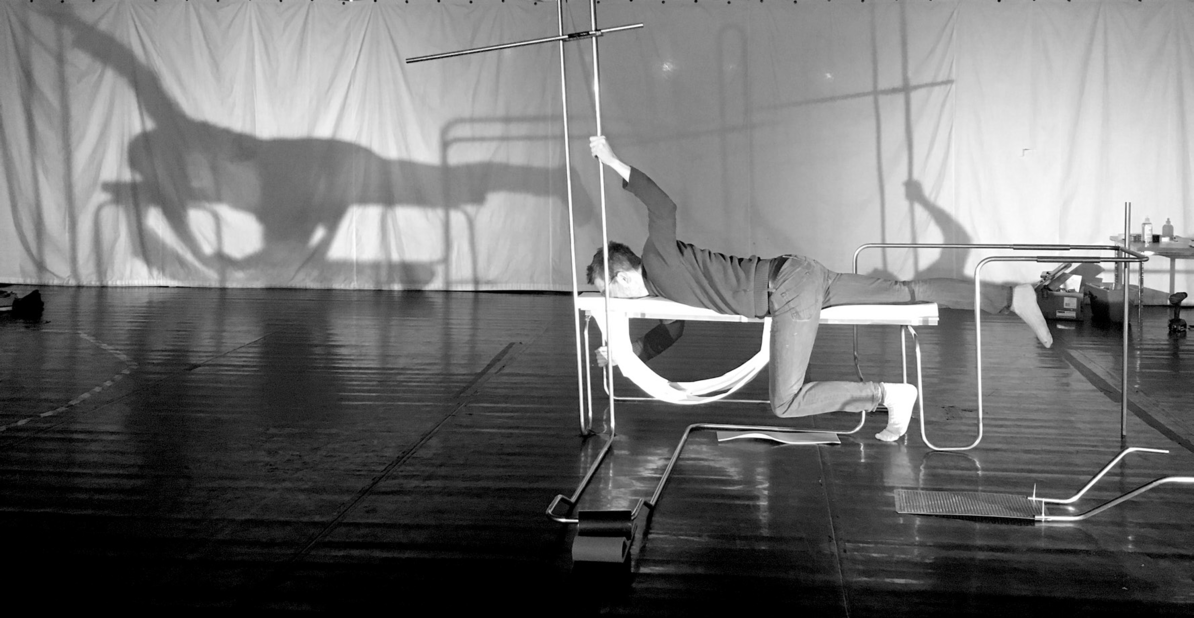 The RGs (short for Rekonstruktionsgeräte or ‘reconstruction instruments’) are the main defining elements of the stage set. They result from a crossbreeding of three inputs: the architectural elements of Klenke’s studio in the Prellerhaus; contemporary fitness apparatuses; and, thirdly, Bauhaus teacher Marcel Breuer’s iconic steel tube furniture, whose materiality, size, and logic they quote. After being conceived as such, the RGs are exposed to a much less clearly delineated and predictable ‘input’: the performing body.
