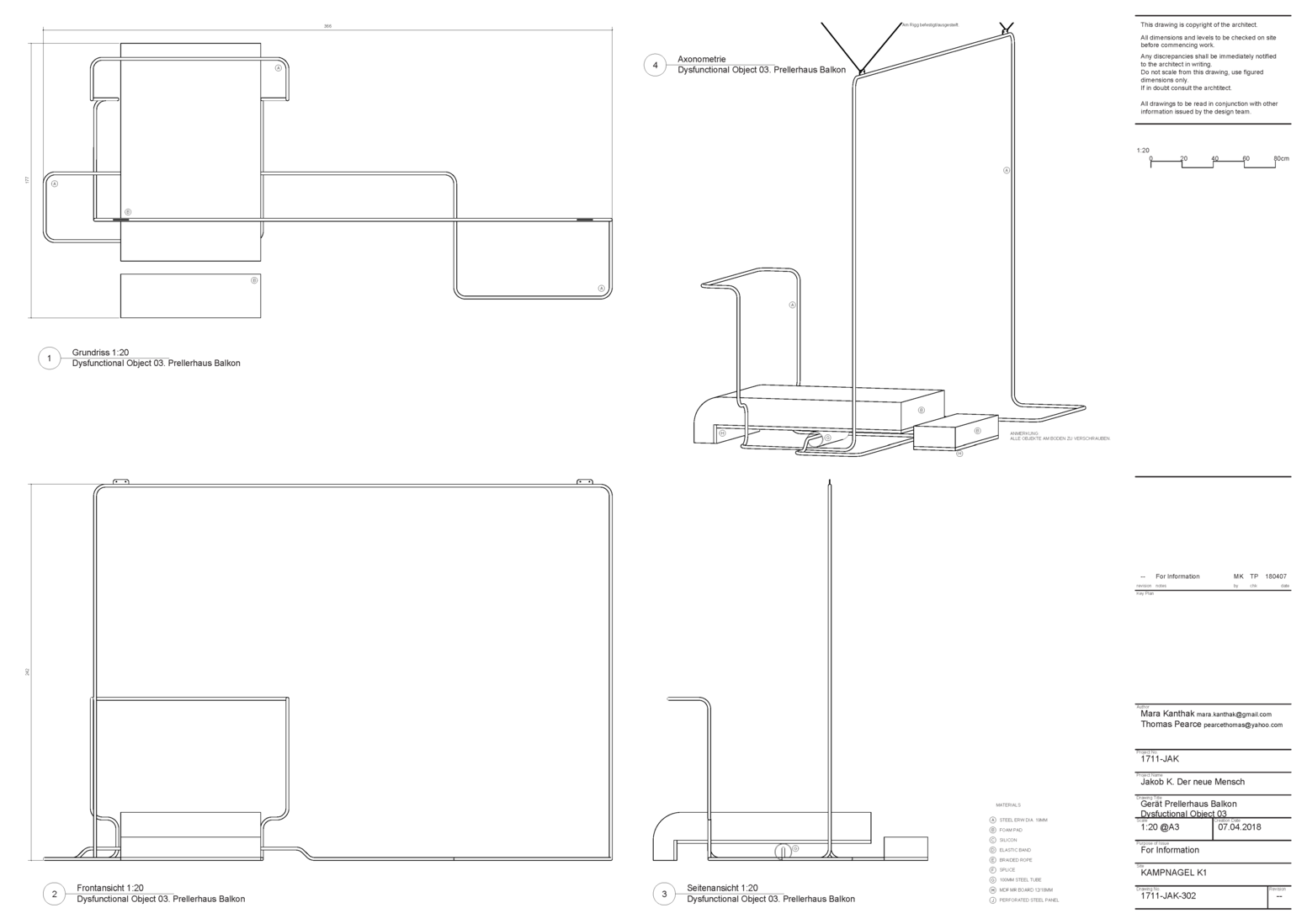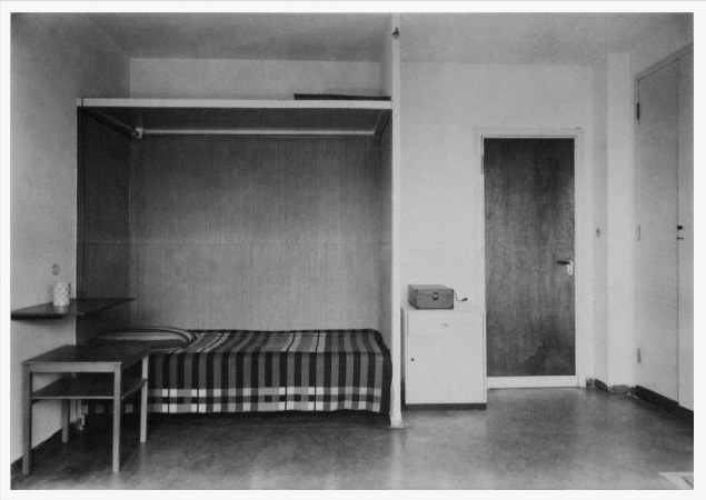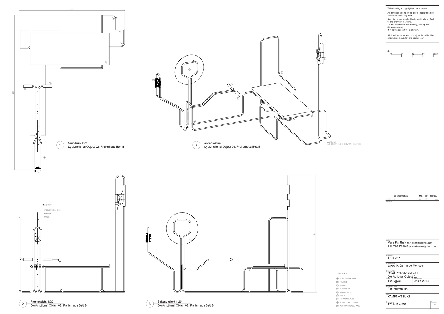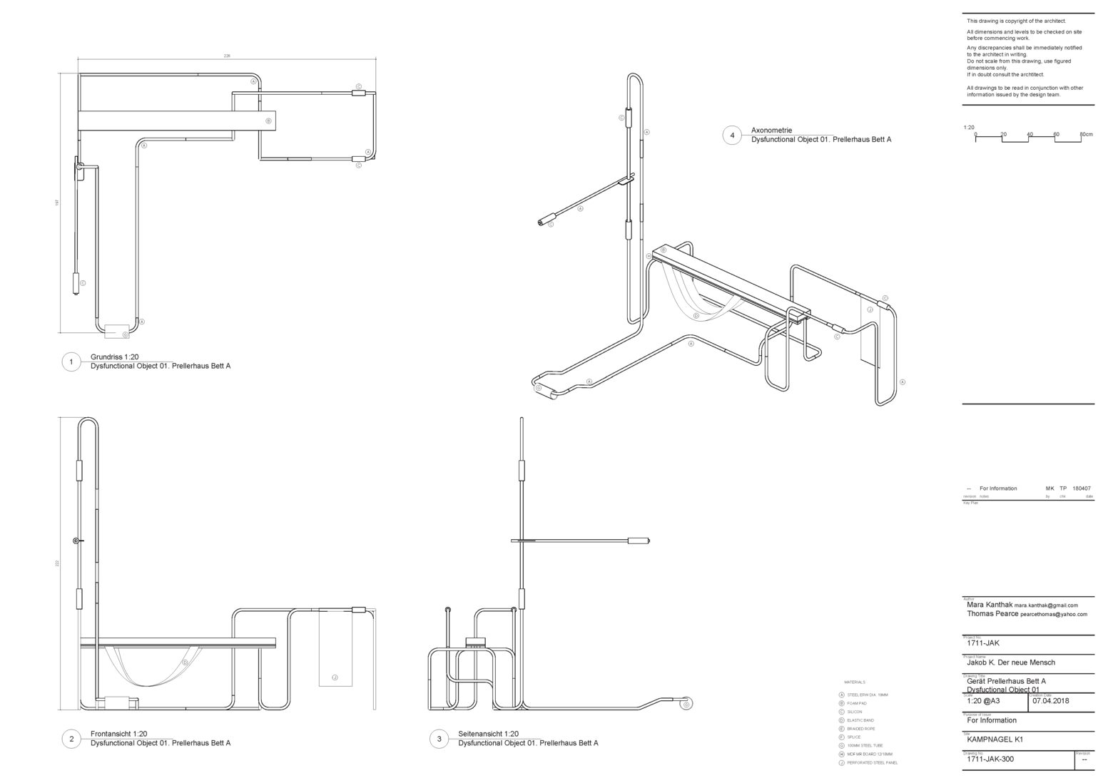 Rekonstruktionsgerät 1 (RG01) is one of two reinventions of Klenke’s alleged1 room in the Prellerhaus, the studio building of the Dessau Bauhaus. The instrument, made of bent tube steel components, adopts the proportions of the bed situated in the corner of the sparsely furnished room, while next to it, a layering of suspended scrim sheets traces the position and proportion of the studio’s door. In RG01, Klenke’s bed keeps its original length but is only 150 mm wide. Lying and sitting on it is awkward.
