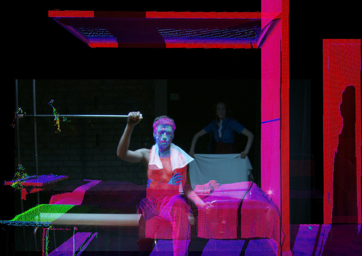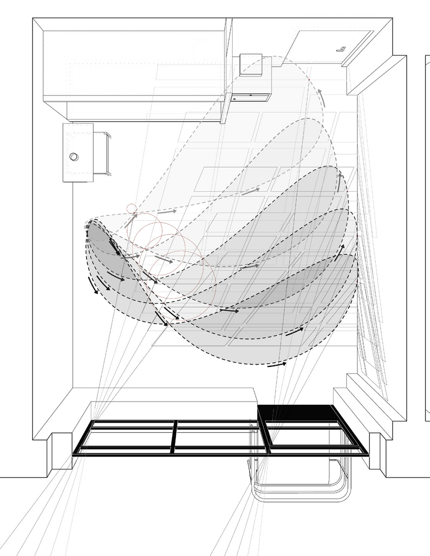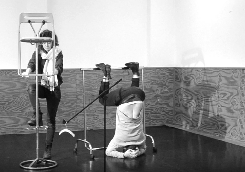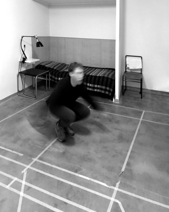 The RGs are developed incrementally and collaboratively by the performers and architectural researchers. At first, we stage site-specific performative improvisations in Klenke’s studio in Dessau (hover over the images for more information). Having returned to our rehearsal room in Hamburg, we arrange found objects to reconstruct the Dessau studio and its furnishing. These objects are then activated by the performers, who dismantle and misuse them for unscripted exercises: a torso rotates repetitively, limited in its degrees of freedom by the axis of a chair perched on a coat hanger; a body is folded to fit within the square proportion of a wardrobe; a clothes rack becomes a rowing machine. In line with Schlemmer, the alterity of these objects, which is regained through their mistranslation by the performers, is used as a constraint and an affordance.