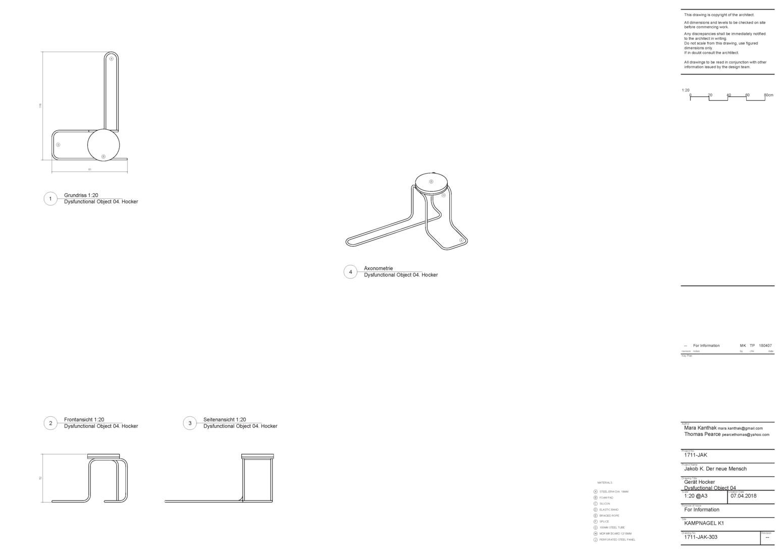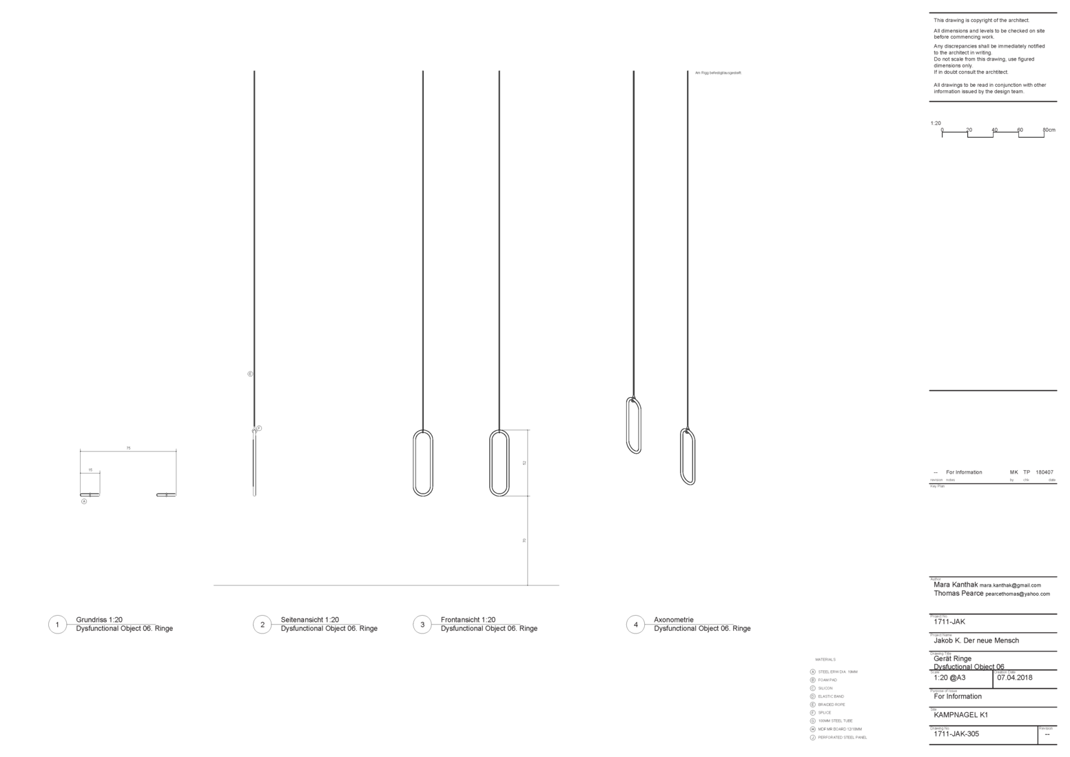 We film these improvisations but talk little about them. The filmic documentation informs the design and fabrication of the first steel-tube prototypes. We start calling these ‘open-ended fitness apparatuses’: we study gym instruments in brochures and borrow their language and articulations yet at the same time withstand their prescriptive functionality. Though imagining and sketching potential uses, we ship them from London to Hamburg with an assembly manual but without user instructions.