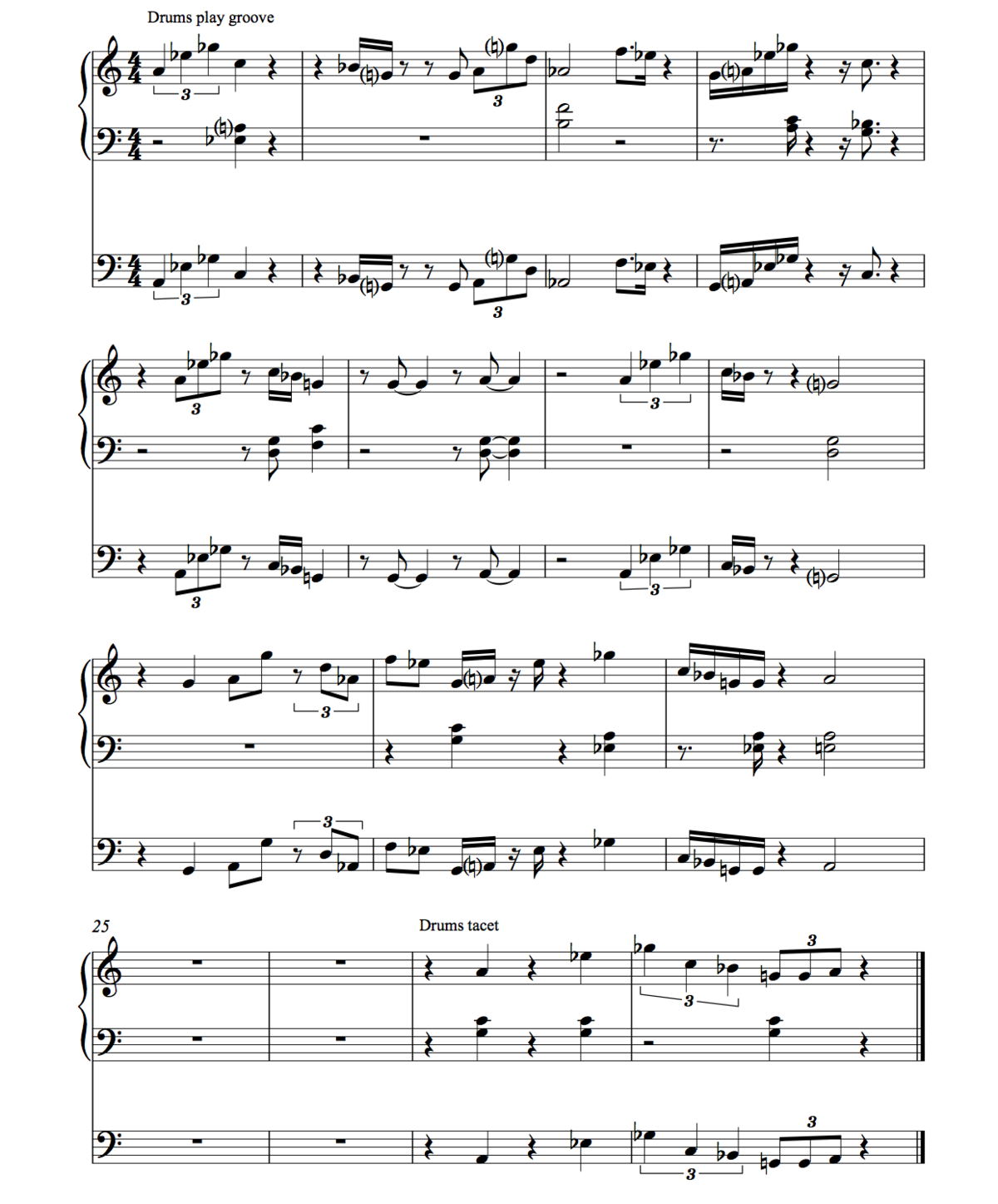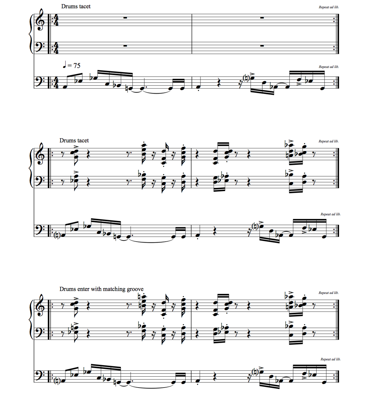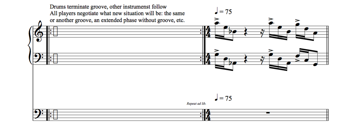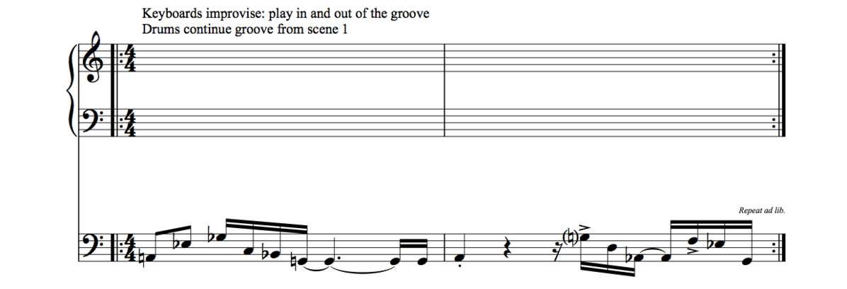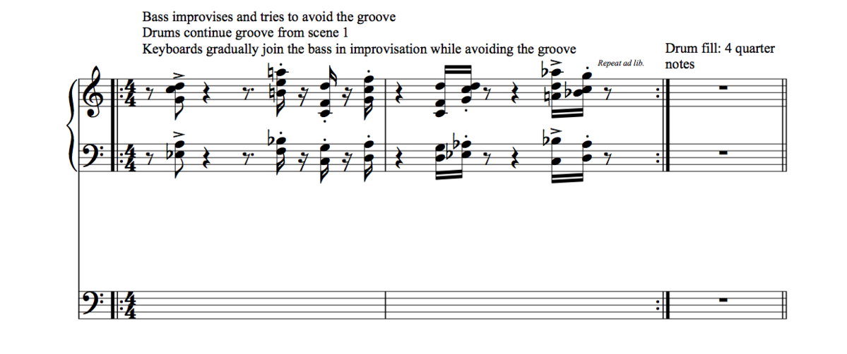 After the theme, the bass improvises and tries to avoid grooving, while the keyboards play the groove from scene 1. Very gradually, the keyboards join the bass in improvising and avoiding the groove, until both instruments play completely out of the groove. This improvisation continues until the drums give a musical cue, consisting solely of four quarter notes, after which the drums and the bass stop playing. Like scene 3, this scene is an investigation into the performers’ hospitability to musical intrusion, and the ways in which, on a musical level, these kinds of intrusions can be dealt with.