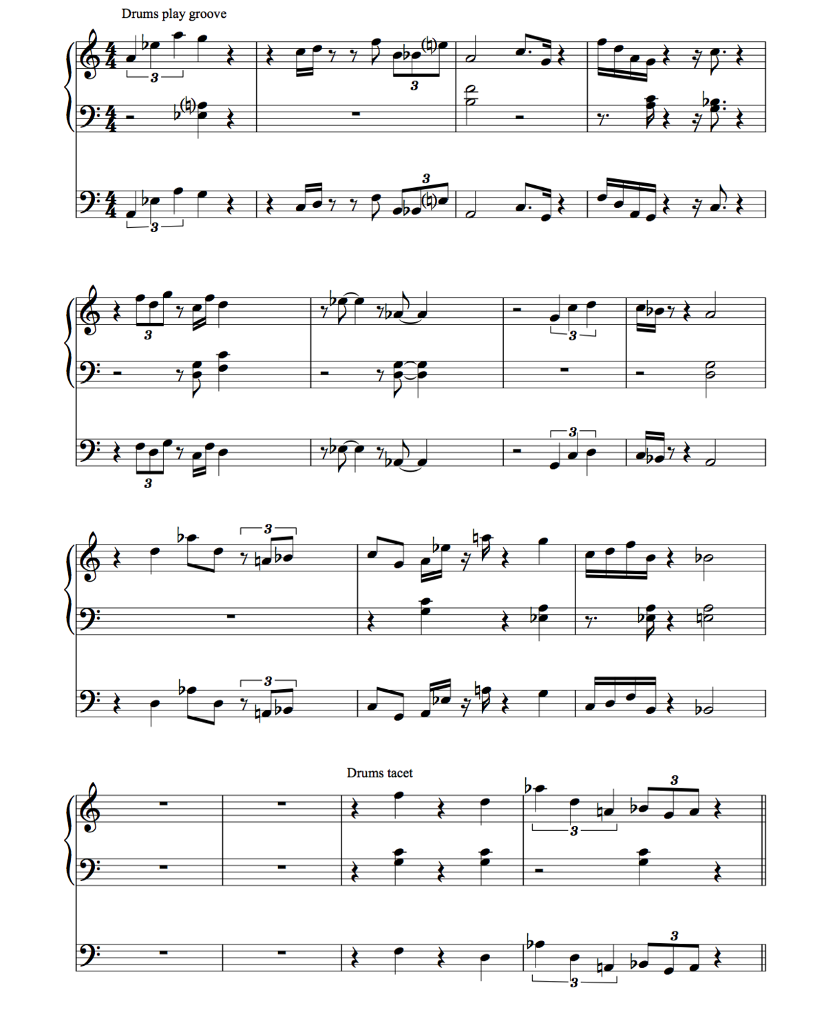 During this scene a theme is played in unison by the keyboards and bass. The melodic material is derived from the bass and keyboard groove from Scene 1. This theme is not supposed to groove, and therefore the rhythm is complicated and does not contain any repetitions or cyclical moments. Instead, it consists of an excess of rhythmical change, which prevents the theme from grooving. To be able to write such an un-grooving theme, imagining how the melody would feel when played was crucial. It appeared to be quite difficult for me to write an un-grooving theme, and I really needed to imagine how the melody would sound and feel in order to arrive at a satisfactory result. Because the drums are supposed to play a groove — except for the final two bars in which the drums are silent — in this scene the tension between groove and non-groove is central. Does the music as a whole still have the opportunity to groove, exactly because of this tension?