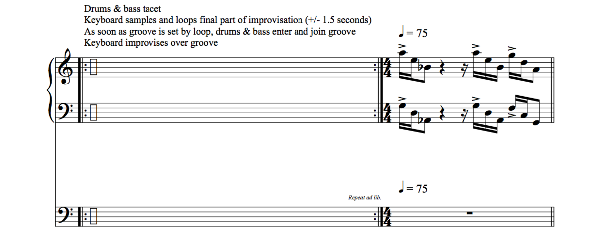This scene begins as soon as the keyboard player starts to improvise. The bass and drums continue playing the bass line and drum pattern from scene 1, respectively. The keyboard player is supposed to slip in and out of the groove, to experiment with going with and against the sense of propulsive rhythm set by the bass and drums. In this way this scene can be considered as an exploration of the possibilities of cooperating with and working against the other players. How hard is it to resist an existing groove? Is it possible to eliminate a groove by trying to ignore it and play something completely unconstructive for the groove, or will it result into another ‘push and pull’ that only enhances the groove?
