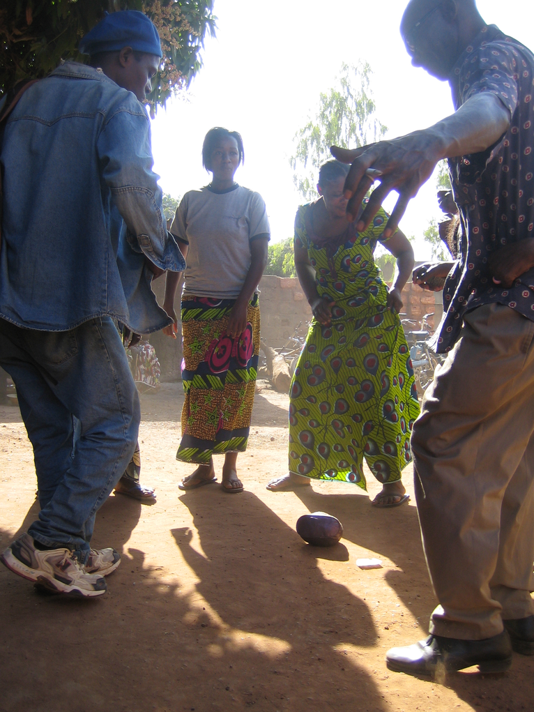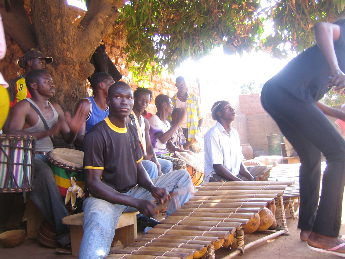 The music performed in the “cabarets” of Bobo Dioulasso has a significant impact on Faso Kan’s music, values, and working methods. The word ”cabaret” refers to an event organized by millet beer vendors and musicians. The event usually takes place in a yard or marketplace, and it starts before midday. Millet beer or “Dolo” is at its best during the day, and it continues to yeast, becoming more pungent and sourer towards the night. (Belliard F. 2001). Often the batch is finished before sunset, and the event closed. The cabaret is an open, public event for both men and women. The clients buy a calabash filled with dolo, and the first drop is always poured on the ground as an offer for the ancestors. The balafons are always in the band’s front, and people give small amounts of money for the bandleader (balafon soloist) to wish for tunes. After paying the band, the person is expected to dance to the song they paid for. In a cabaret, it is typical that people dance together in a circle or other formation. The atmosphere is often very relaxed and spontaneous. The roles between the musicians and the public are flexible, and sometimes the musicians join the dance too. Interaction and communication are essential for the course of events, and people are actively searching for ways to challenge, entertain and encourage each other on the dancefloor. The band has to be able to perform all the wishes by the public, and the soloist needs to accompany the dancer’s improvised steps on the go. To live up to the public’s expectations, the band members must master an extended repertoire and perform it freshly. Most of the musicians come from griot families.