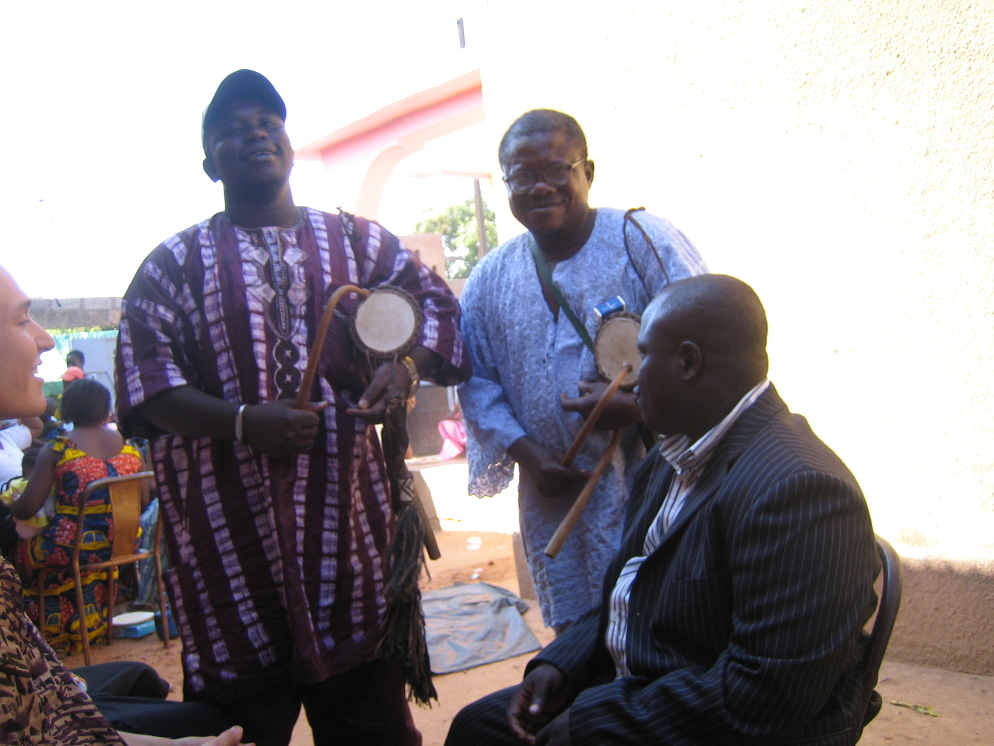 Photo: The talking drum players are praising master drummer Ousmane "Zoumana Dembele" during his son's wedding festivities. Bobo Dioulasso 2009. NEXT PAGE