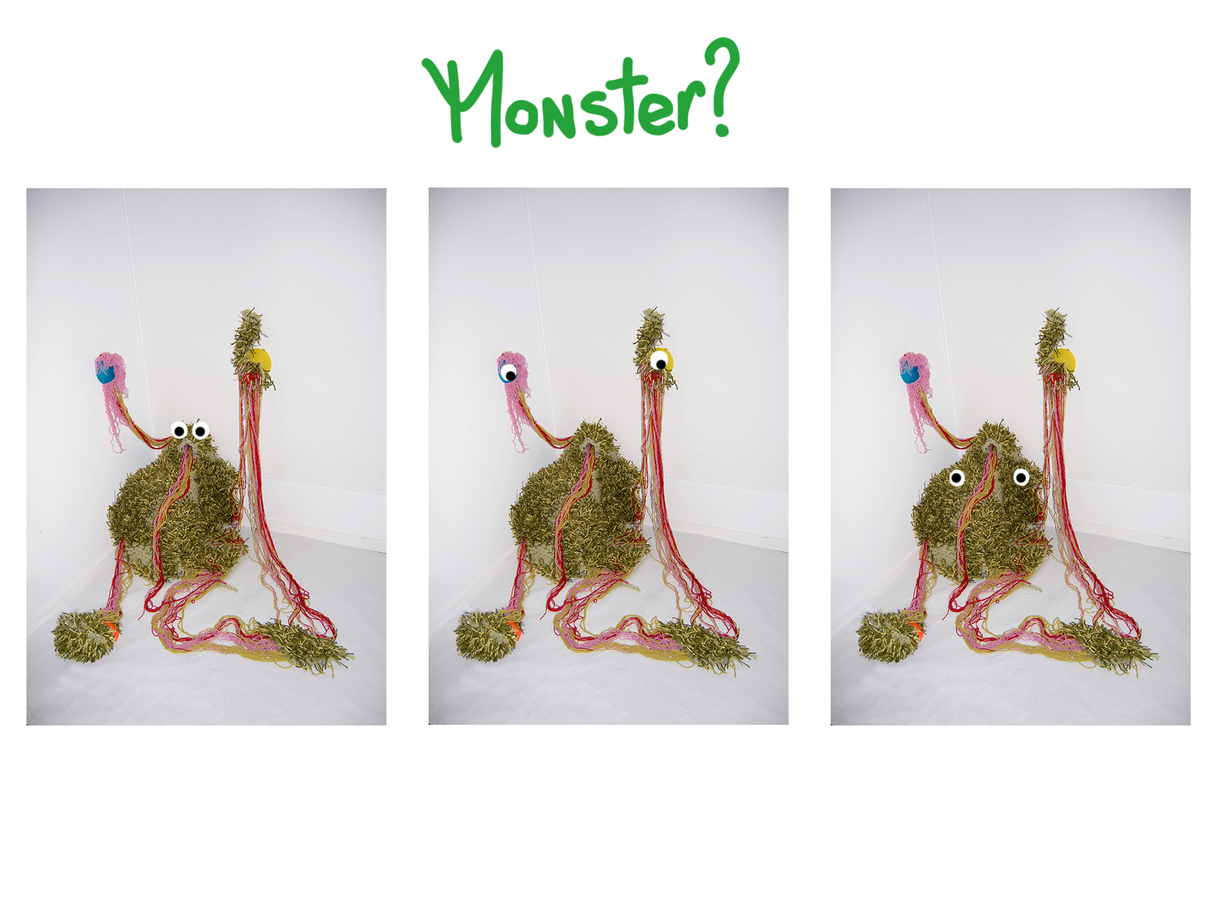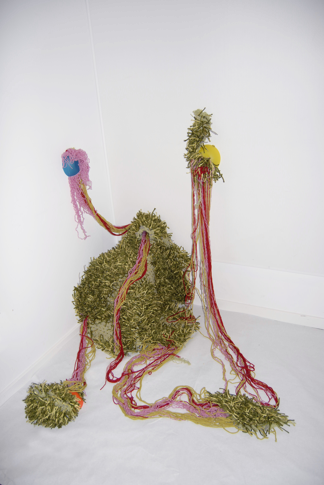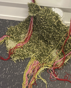 By taking the carpet apart and connecting it through long threads I referred back to the knitting samples of the technical course. The yarn serves as the connector and connects the separate parts in different ways. During the process, other ways of connecting emerged. For example the connectors came through the hole and this made the connectors more connected to the other part. Instead of connecting to the section, the connector is connected in the other section.