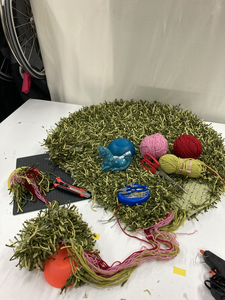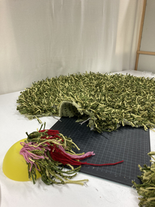 I had a carpet, plastic bowls, and yarn. I started with manipulating by removing threads to create empty spaces in the carpet. By doing this, connecting through removing instead of adding something became a possibility. The leftover threads were used for the bowls to make them part of the carpet. By cutting and reattaching the carpet gets curves and an extra layer, which is taken from the knits from the technical course. The flat, the threads and the curves give it three different dimensions.