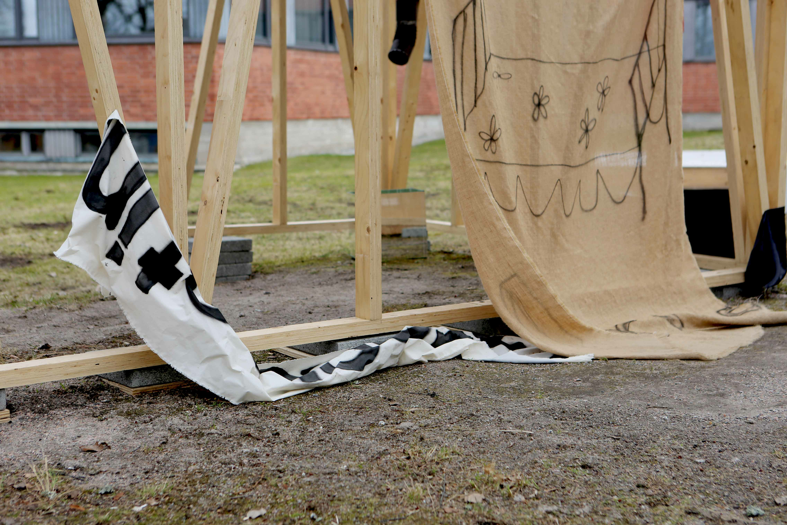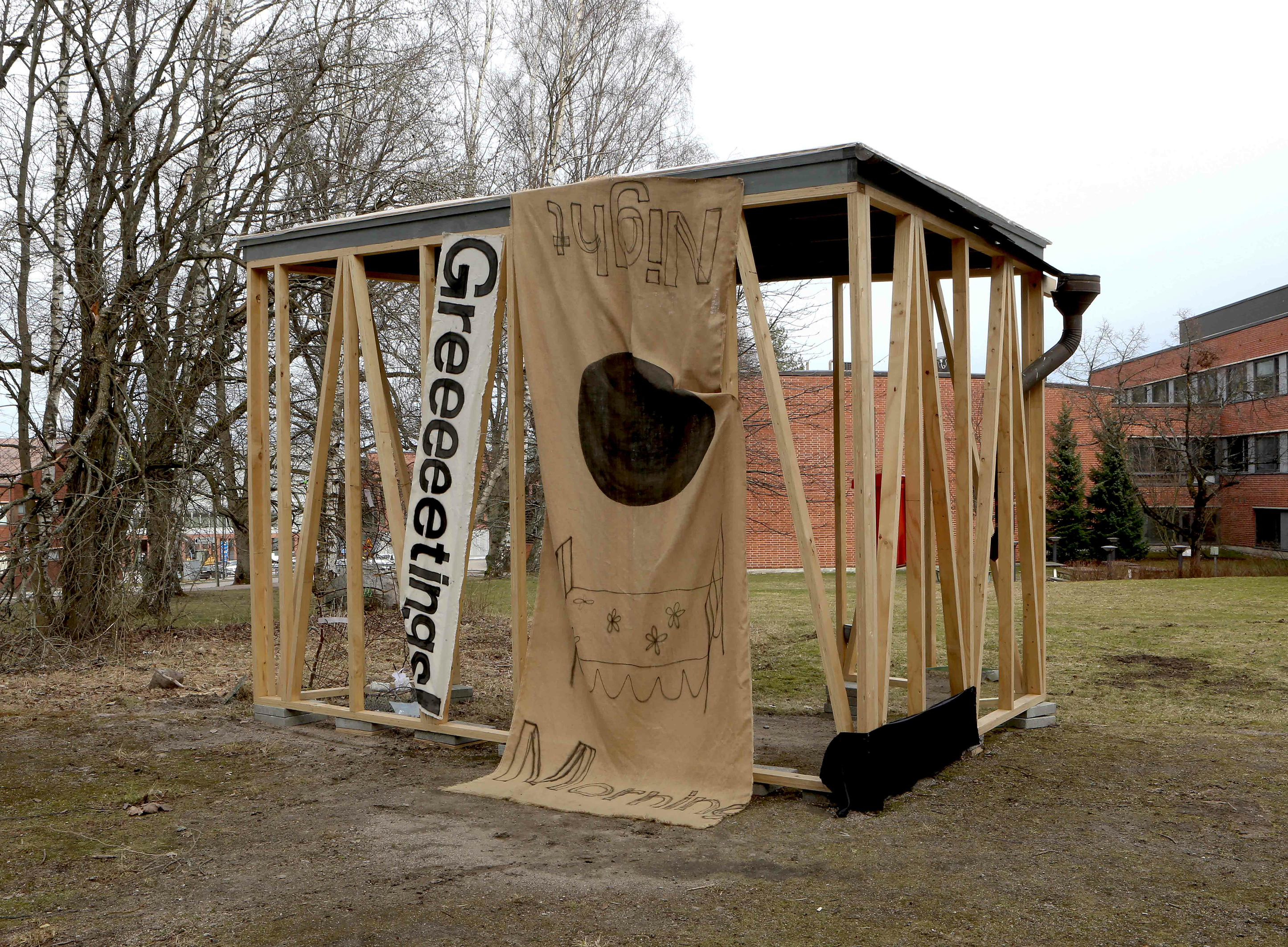 It almost kind of happened. After I had installed everything to Matter there was a two-three day storm in Helsinki. The wind was blowing so strongly I was sure my work would collapse. I went to check everything on afterwards. I thought the bigger piece would have been ripped but it was steadily hanging there. However my greeeeetings were ripped off the nails and on the ground. It could have been a possibility to leave it on the ground - to let everyone see the effects on having an exhibition outside. I then felt it wasn't yet its time to be abandoned, so I hammered it back with few extra nails.