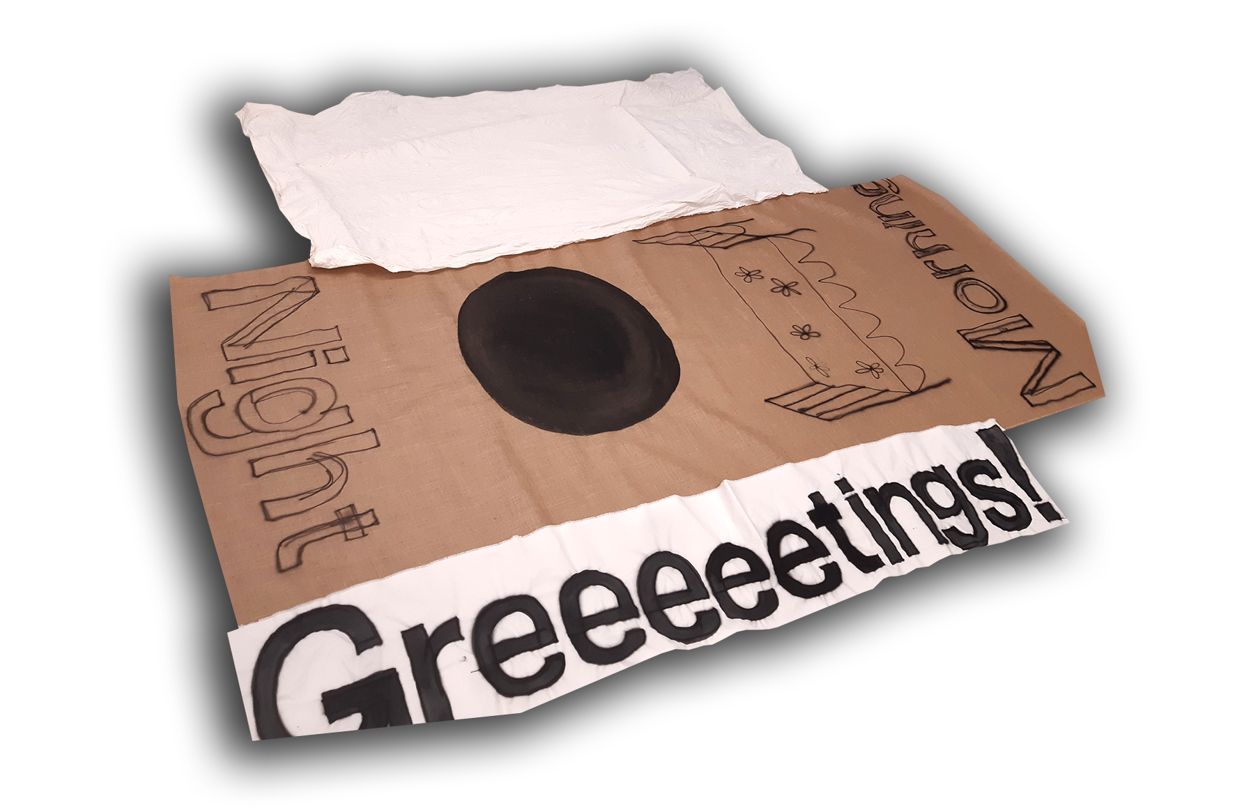 On my final work I decided to show the most essential pieces. The greetings was a funny way to introduce the story for viewers. Its literal language gives clues of what the work might be about without explaing it and leaving room for interpretations. Together with the bigger raw linen they had a connection that felt natural. In a way I see them complementing each other. There also was an idea to make evething into a classic painting canvas but then the interpretation would have been totally different. I didn't want the process to be seen as paintings eventhough I was somehow painting it. I wanted it to flow in time as does every day.