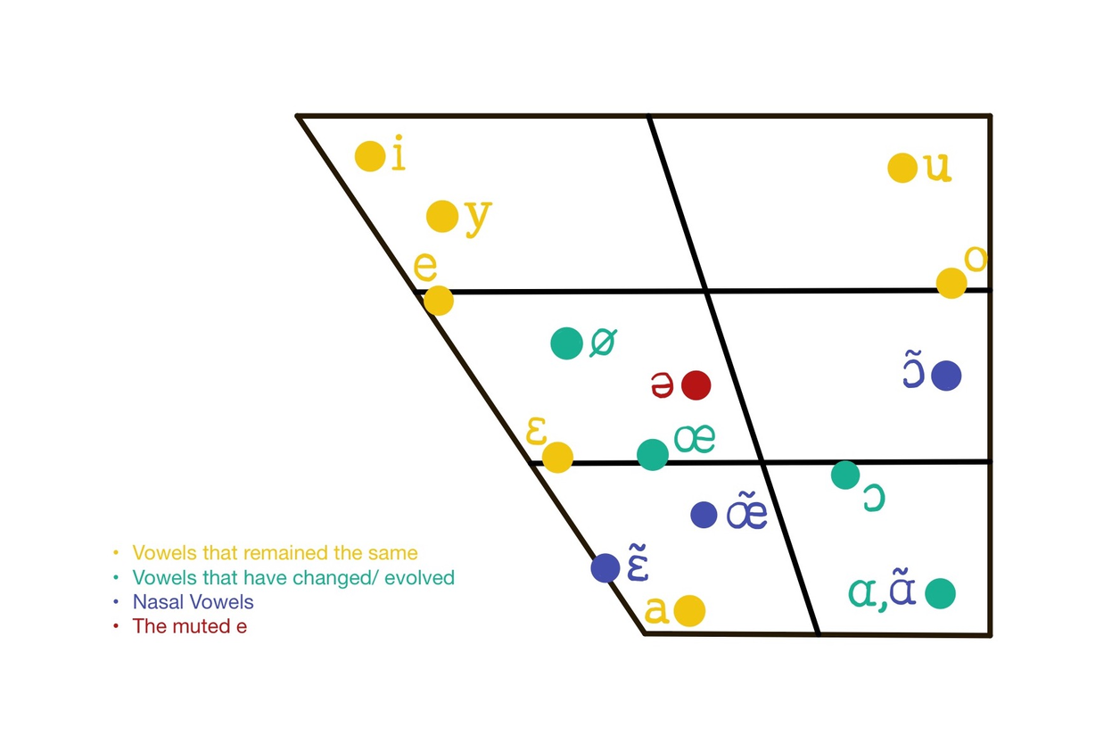 In terms of the vowels, modern French shares many similarities with 17th-century French, but at the same time, there are certain distinctions which can be noted by studying Figure 1 on the right.