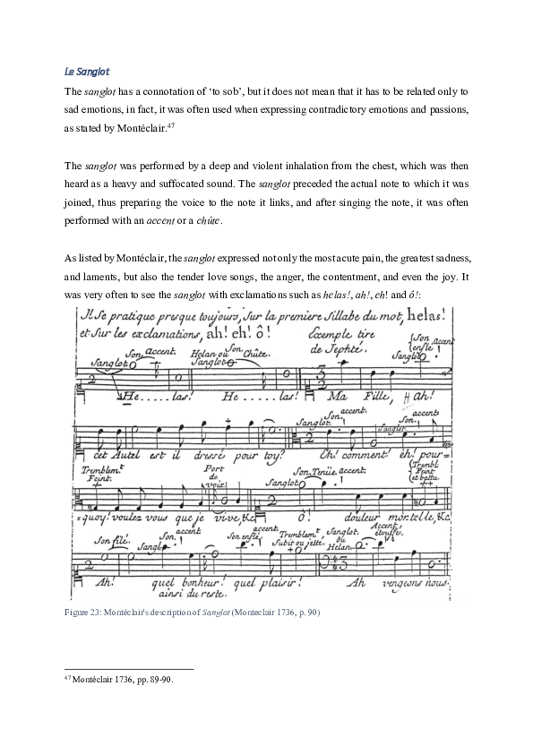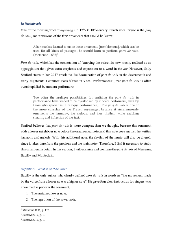Throughout this chapter the primary references I have consulted include the 1636 treatise Harmonie Universelle by Mersenne, the 1668 treatise Remarques by Bacilly and the 1736 treatise Principes de Musique by Montéclair. The contemporary reference includes Sally Sanford’s 2017 article ‘A Re-Examination of port de voix in the Seventeenth and early Eighteenth Centuries: Possibilities in Vocal Performances’.