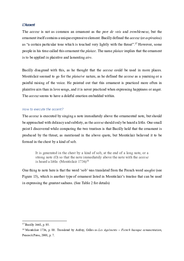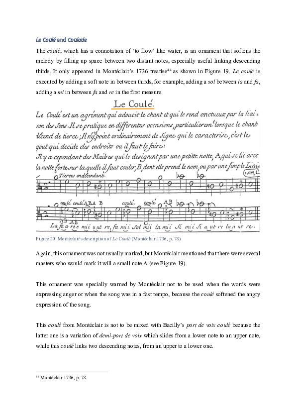 We have now a basic overview of the 17th- and early 18th-century French vocal ornamentation. We have looked at how some of the ornaments were executed and in what condition we could apply them. It is clear that for Bacilly, for example, that some ornaments could only be applied in long syllables. As for Montéclair, he stated that some ornaments were used in certain expression, for example, that the coulé was never used in expressing anger. The omission of some more complex ornaments, the passages and the diminutions has been intentional, in the hope of narrowing the scope to better suit the intention of this research.