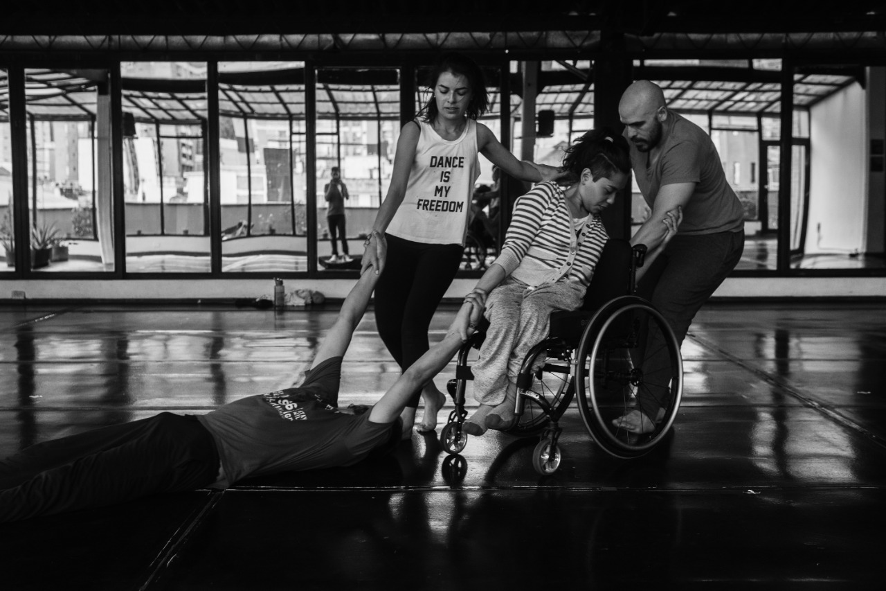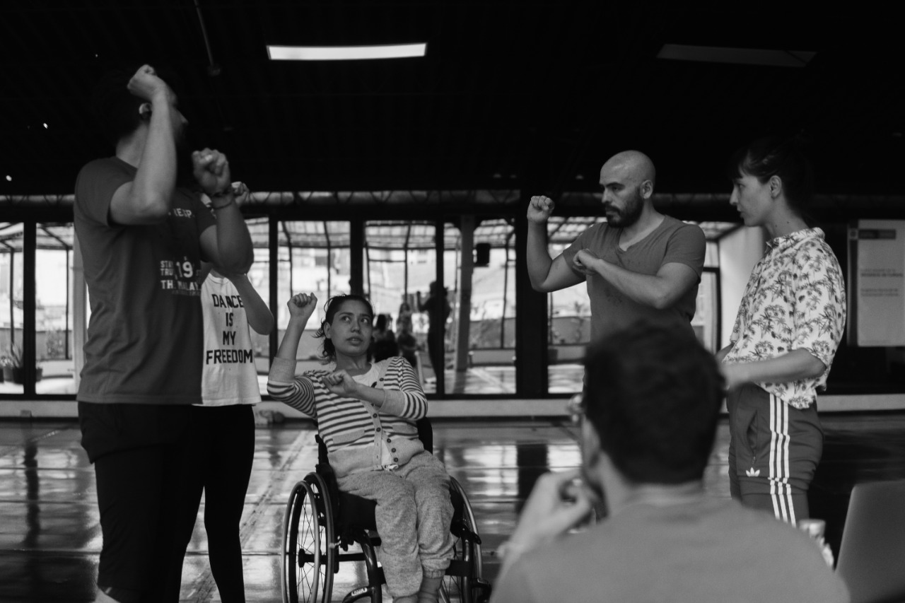AUDIO: todo los aparatos electrónicos en mute. Solo se oye el desplazamiento de los bailarines en el espacio generando un ritmo muy bajito, lo más pasito posible.