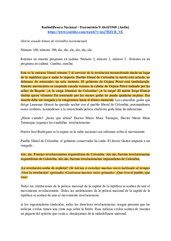 - Pautas sonoras: Cristian hace ruidos como un loco, Lorena dice fragmentos del discurso de Gaitán con voz vigorosa, Laura describe lo que está sucediendo en ese momento con voz de Gaitán, Mateo describe acciones que pasaron en las protestas recientes del 2021.