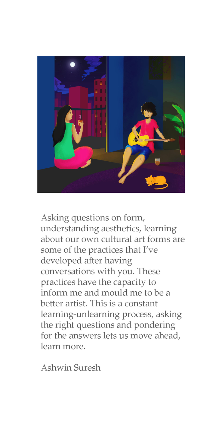 I invited students to participate with me through chat or share in their reflections by email. Some thoughts, we also discussed over our one-on-one meetings in MS teams or over phone calls. Some others would happen on individual chat boxes as we considered this conversation in relation to their own projects, creative work, evolution of skill, or building new practice. Others choose to remain silent sharing a recognition and acceptance taking their own time to find words and thoughts. Diverse formats, voices of reflection have evolved here, aided by the possibilities of technology and the way time and space works in a chat app. We have each messaged and written when our hearts are full, thoughts are bubbling, others are silent. We have spoken in our own time and spaces, allowing time to embrace and weave in and out of our conversations creating new meanings and relationships.
