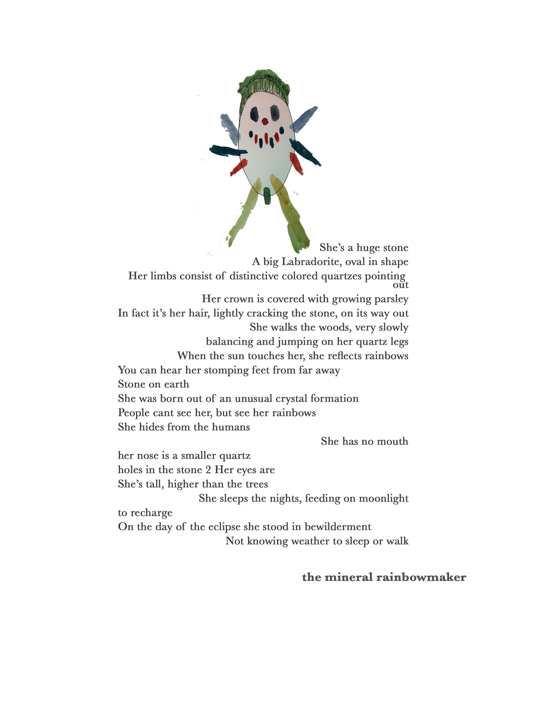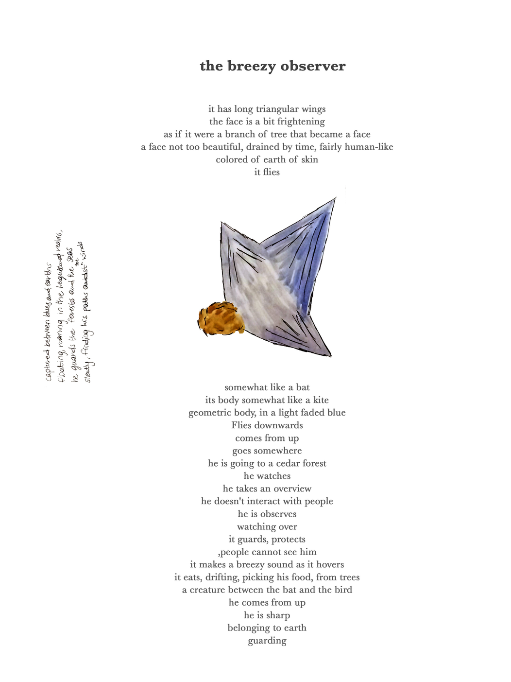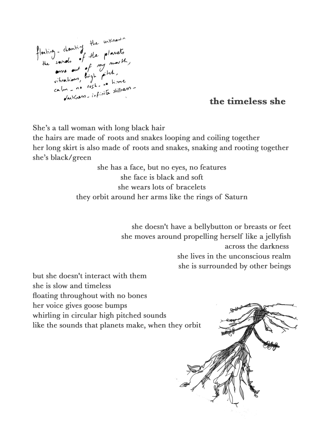 - Once the being is created, I a moment for the participant to either draw it on a paper, write a poem about it or both - with opened eyes.
