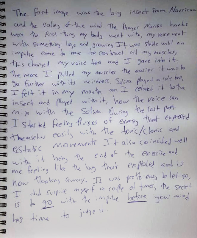 I received the video of exploration of 12 different people and their physical reflective material on paper. All of the participants decided to send me their videos. After watching and analysing the material, I chose 5 specific experiments that I believed would create a constructive output to coining methodology for inducing “wild states”; I selected these particular 5 because each had an important element and they were very different from each other allowing an interesting diversity of results. With these 5 people specifically, I continued a longer conversation in which I shared my observations and listened to their notes regarding them. We focused on many aspects, some more physical and some more psychological, questioning whether they found movement or voice material that they had never gone through before and if they were able to push their boundaries and explore things they hadn’t touched on before through the embodiment of imaginary bodies.
