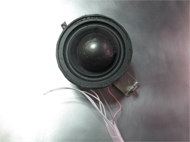 The right hand, right knee and both foot elements make use of a speaker to convey vibrations. Both the right hand and the right knee elements are incorporated into a stainless steel soup spoon. For each foot element a speaker is glued into a velcro strap. The speakers are extended with a rubber form to transfer the movements of the cone to the body.