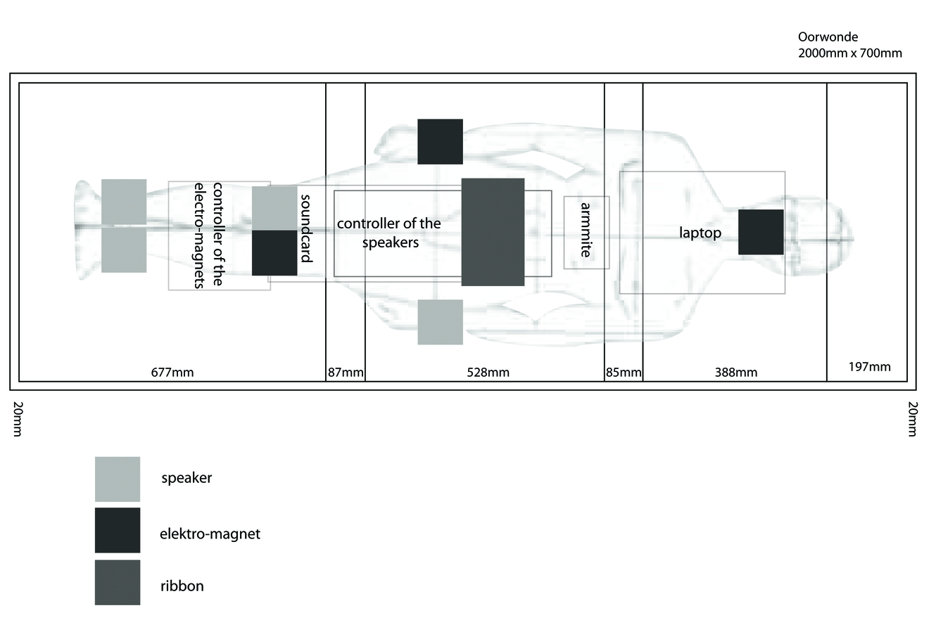 Oorwonde’s focal point is to bring across sounds that balance on the border of the audible. To achieve this the sounds are conveyed in various ways; speakers, electro-magnets, a vibrator motor and a piezoelectric disk are assigned to specific places on the human body. Oorwonde further explores the concept of bodily hearing as the various elements are aimed at different body parts. Hearing is no longer restricted to the ears.