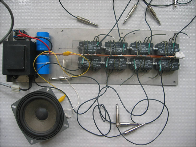 The idea to feel sound is not new, but the invention of audio transducers made it easier for artists to create works based on the sensation of sound. One of the first to give shape to this was Bernhard Leitner. Leitner created several works in which sounds are aimed directly at the human body. For Leitner, listening is not limited to the ears, but is extended to all parts of the body. (Schulz, 2002) He makes use of various interfaces to bring across his idea of bodily hearing. In hand-ton-objekte two objects consisting of a speaker integrated in a plexiglass bowl equipped with a handle were aimed at various parts of the human body. (Leitner, (1)) Following this first experiment Leitner created Ton-Liege, a reworked wooden deck chair with a subwoofer placed at calf height and another subwoofer directed towards the lower back. (Leitner, (2)) Leitner buildt further on this idea in Liege mit 6 Lautsprechern in which he added one speaker at thigh height and attached another speaker at shoulder height. Two extra speakers were incorporated, not in the chair itself, but placed left and right of the chair slightly above ear level. Leitner's idea was to let sound waves move through the body. (Leitner, (3)) Around the same time of Liege mit 6 Lautsprechern he created Ton-Anzug, a body suit with a built-in grid that allowed him to attach loudspeakers to various parts of the body. (Leitner, (4))