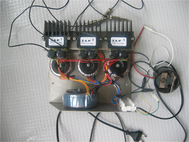 Electro-magnets, recycled from old signal-horns, were used for the left hand, the left knee and the neck element. The electro-magnet integrated into the left knee element is of a different type to the electro-magnets at the neck and left hand and therefore gives a different sensation. The vibrations of the electro-magnets are transmitted through molded rubber shapes. The electro-magnets at the left hand and left knee elements are incorporated into stainless steel soup spoons. A neck support was welded onto the table and comprises the neck element.