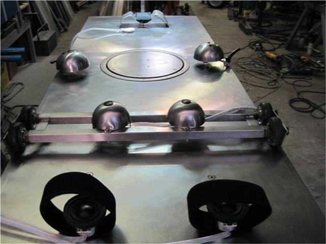Electro-magnets, recycled from old signal-horns, were used for the left hand, the left knee and the neck element. The electro-magnet integrated into the left knee element is of a different type to the electro-magnets at the neck and left hand and therefore gives a different sensation. The vibrations of the electro-magnets are transmitted through molded rubber shapes. The electro-magnets at the left hand and left knee elements are incorporated into stainless steel soup spoons. A neck support was welded onto the table and comprises the neck element.