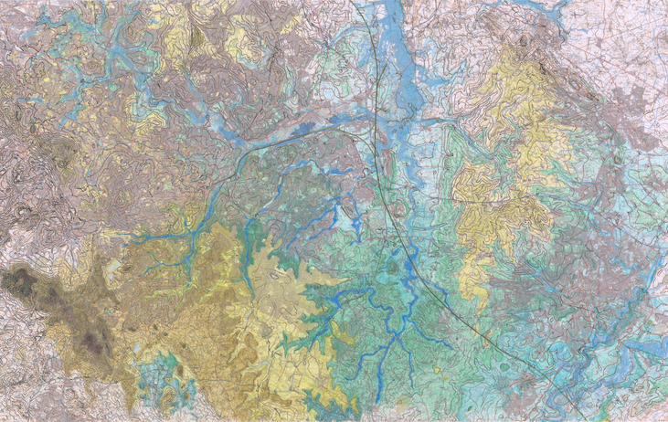 The method of overlaying of a range of regional maps with different kinds of scientific data in the anticipation that the objective answer will emerge once enough data has been amassed has a long history in landscape planning (see: Walker and Simo, 1994) and in many quarters, although this, colloquially known as McHarg's layer cake method may not be utilised, the planning process in general, is presumed capable of being objective, neutral and based on facts alone. The philosophical starting point of this research is fundamentally different, subverting the idea that it is ever possible to be objectively neutral.  Every image is stuffed full of analysis from the beginning.  The maps aim to show places in a way that cannot be experienced by wandering around but that is absorbing and new, that gains attention and is memorable and so become part of our identity and culture. They create powerful connections to our territory. Inverting the usual way of representing the world, prioritising topography, rivers and streams over roads and buildings can be mind-blowing.