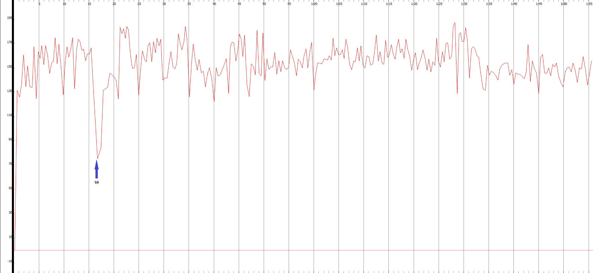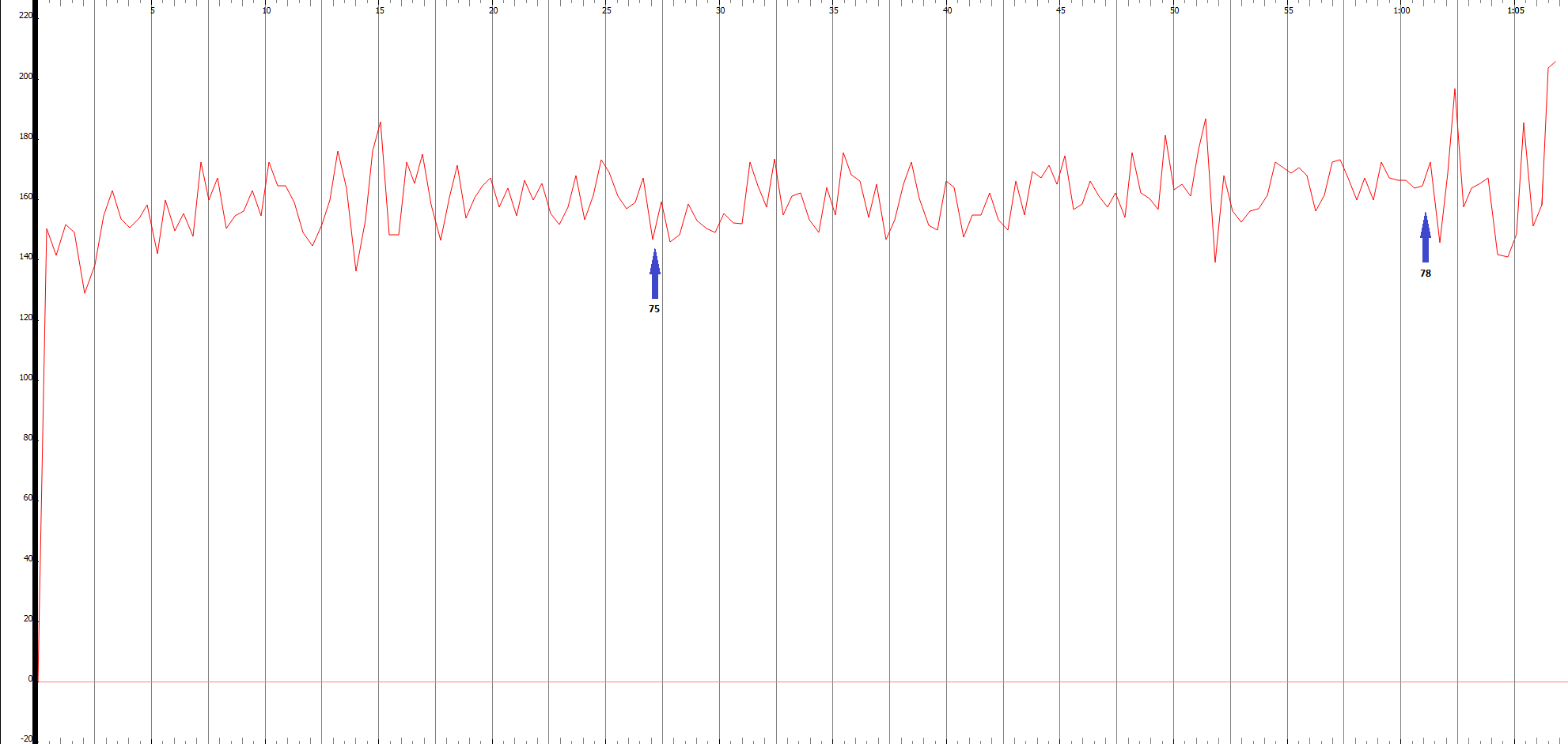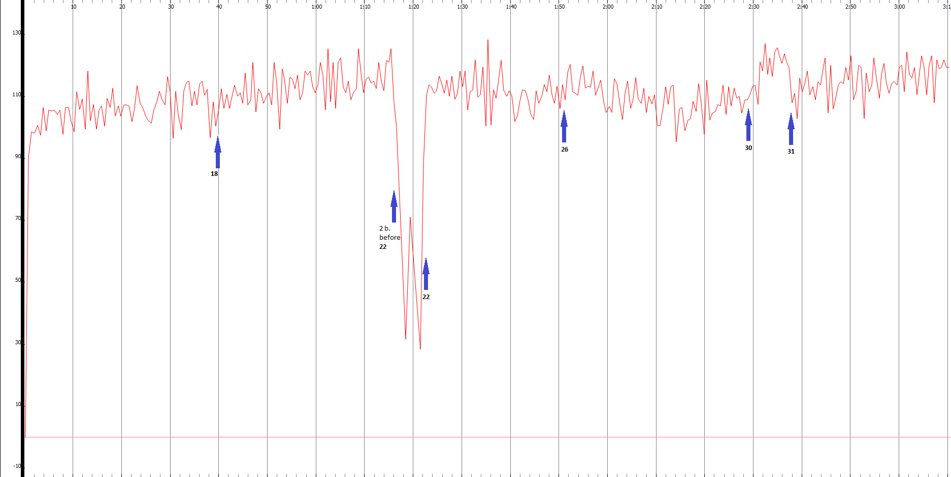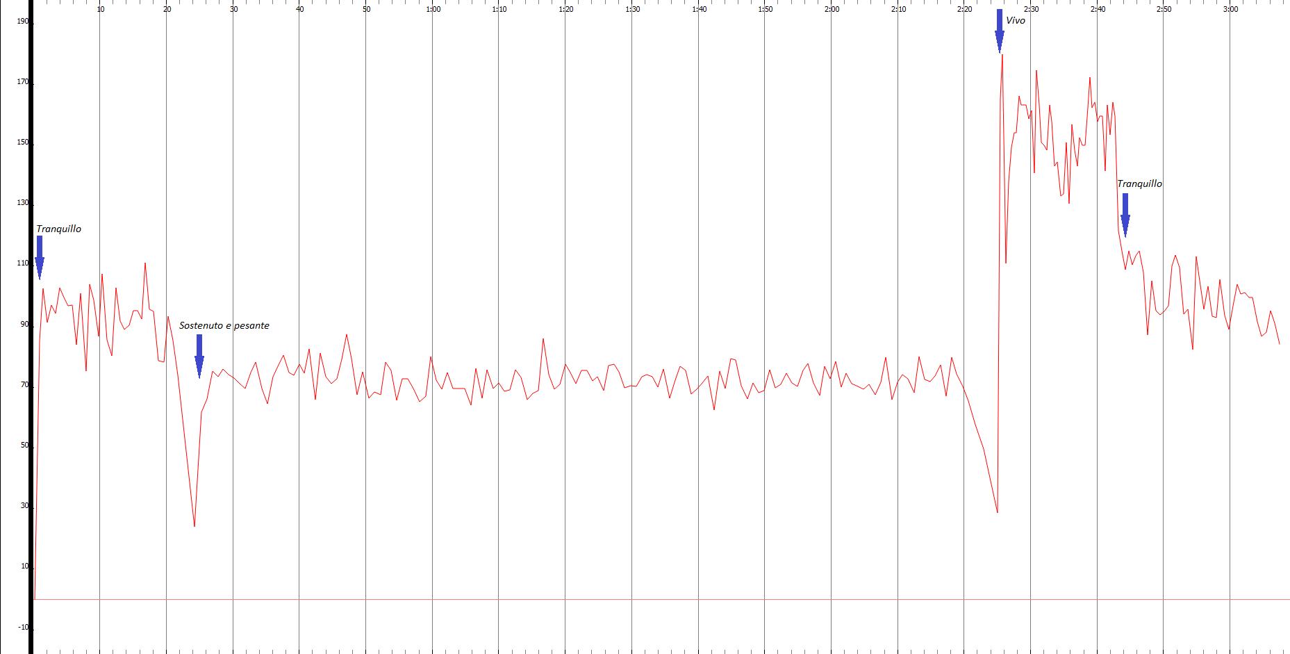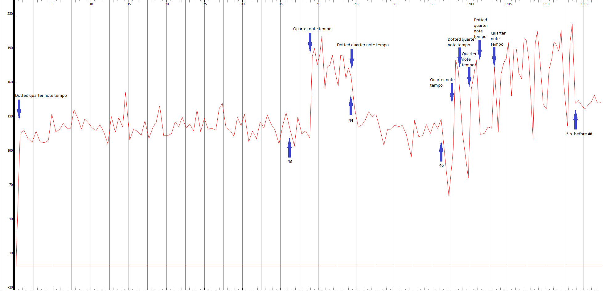 Figure 3.3.2.1.5, Tempo graph, with vertical axis indicating bpm, of Monteux’s recording of Stravinsky’s Le Sacre du Printemps, Part 1, Ritual of the Rival Tribes.