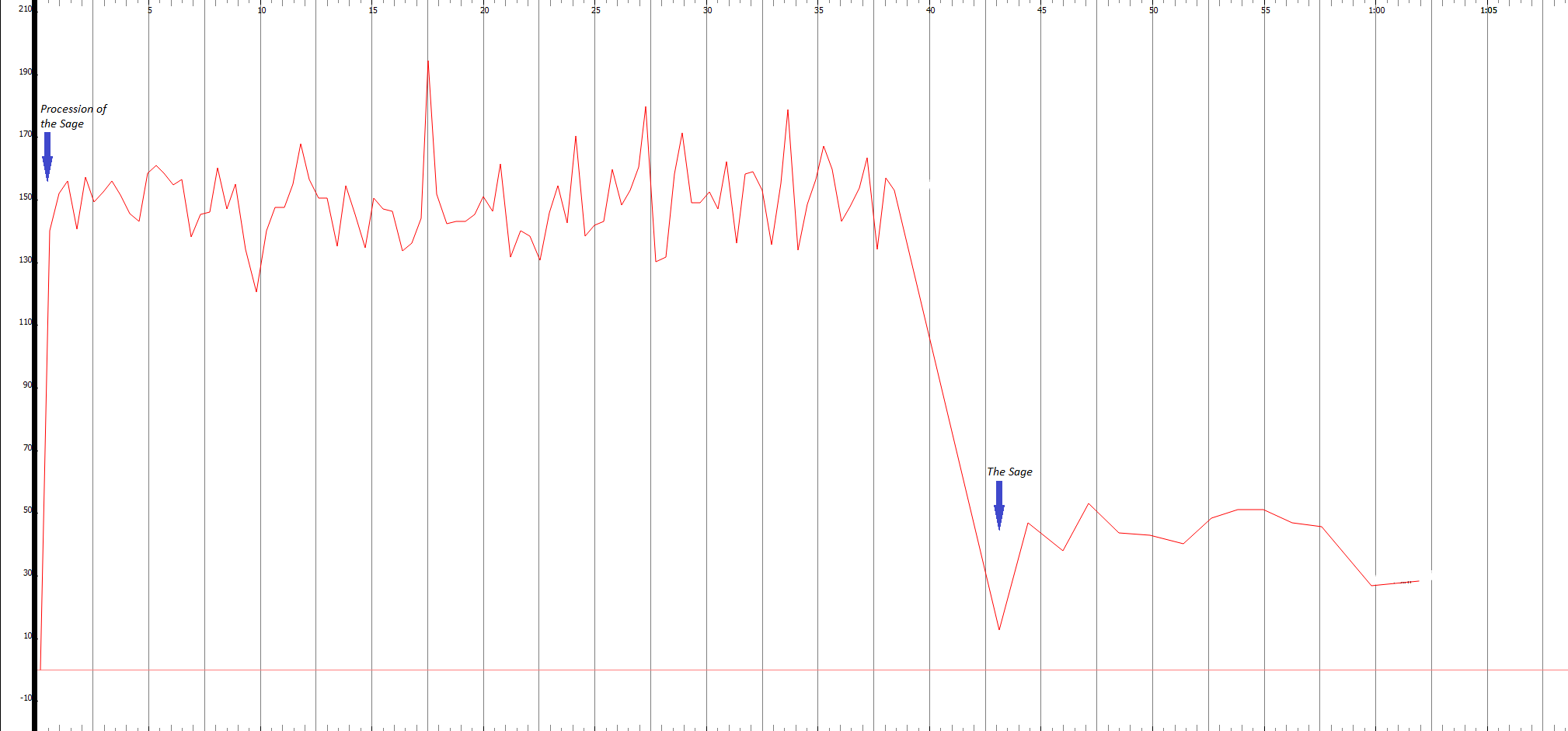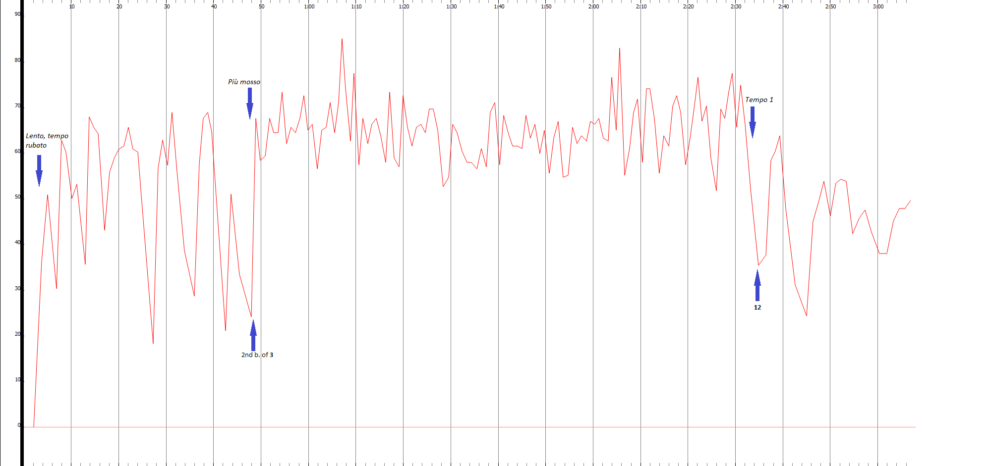 Figure 3.3.2.1.1, Tempo graph, with vertical axis indicating bpm, of Monteux’s recording of Stravinsky’s Le Sacre du Printemps, Part 1, Introduction.