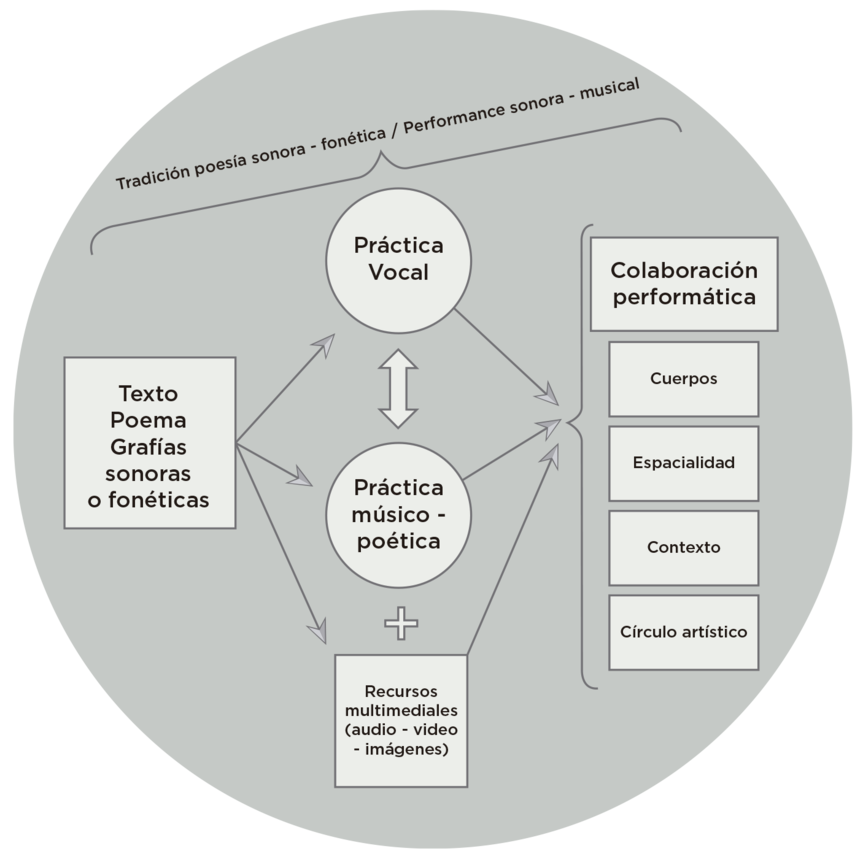 La muestra despliega los resultados de la colaboración sonora con los poetas sonoros Luis Bravo y Pía Sommer durante el transcurso de mi investigación doctoral. La muestra se estructura según los modos de colaboración, y los audios y videos se consideran los registros de una constelación de colaboraciones en torno a la las prácticas vocales, que excede a nuestras agencias humanas, incorporando también la agencia material de la tecnología y de nuestros círculos artísticos. En las intervenciones electroacústicas se trabajó a distancia sobre poemas sonoros previamente fijados por los poetas. Para las colaboraciones performáticas se incorporó el uso de instrumentos y efectos en vivo, y el trabajo a dos voces. Se trató de dos encuentros con cada poeta entre diciembre de 2019 y agosto de 2021 en Chile, Uruguay y España. La muestra incluye también las entrevistas realizadas a ambos poetas y las bitácoras de trabajo durante los encuentros. Por último, también se incluye una sección de archivo de la circulación artística y académica que ha tenido este trabajo.