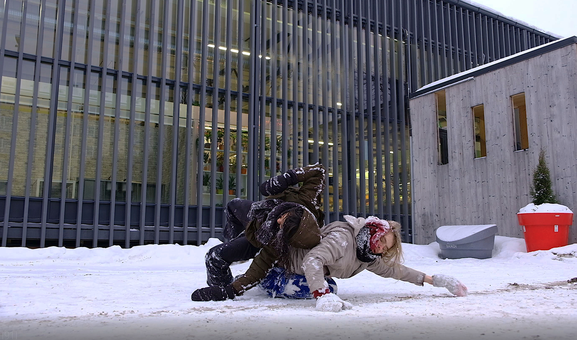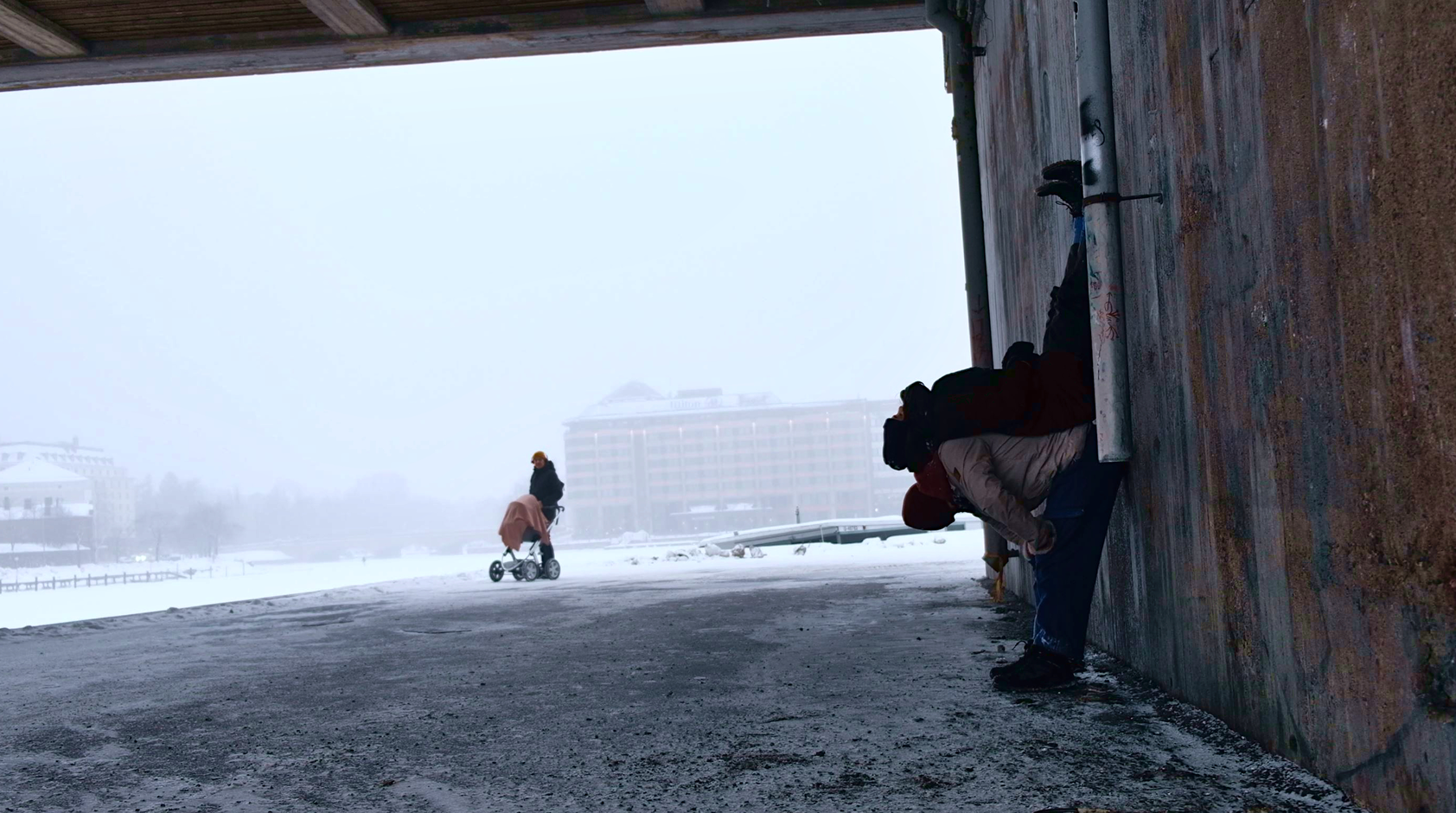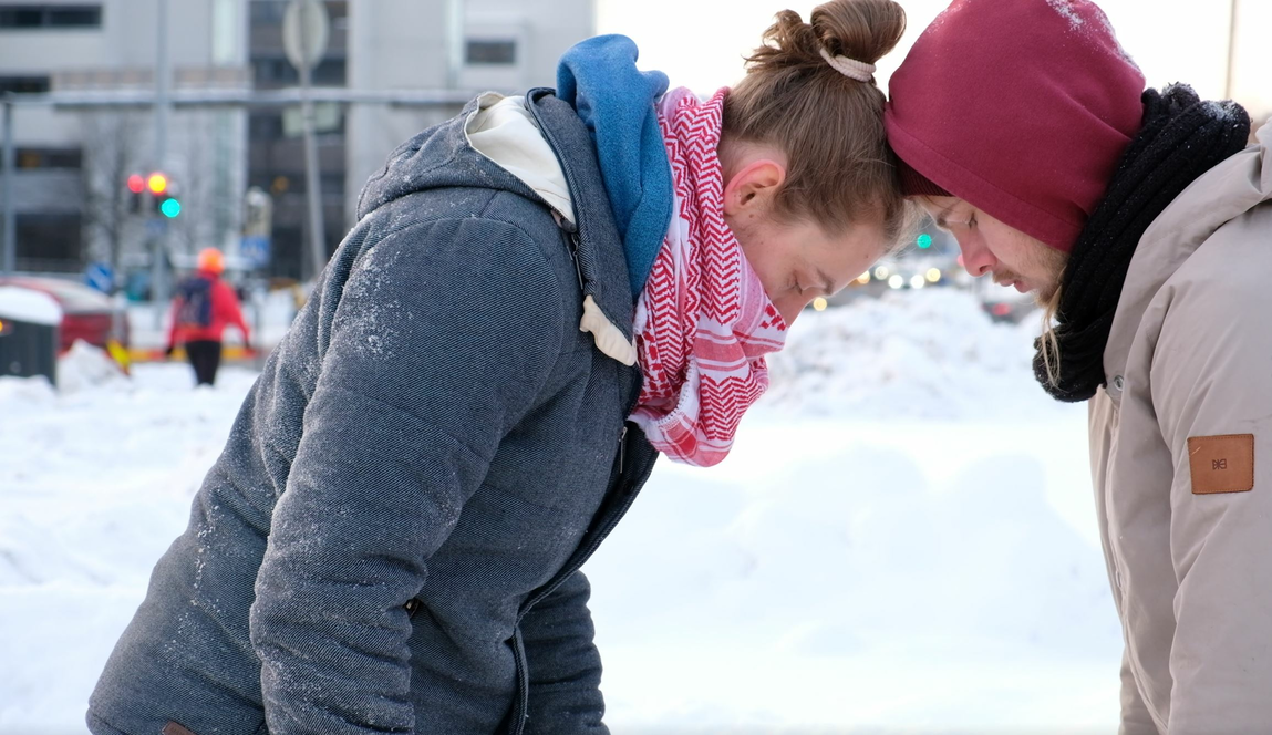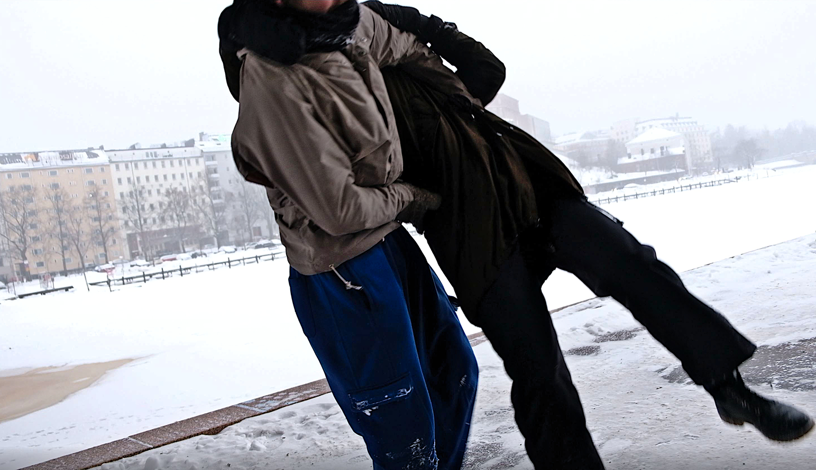Lähtiessäni suunnittelemaan tätä tutkimusta kiertelin ja kaartelin erinäisten rajausten kanssa. Oli selvää, että kehollisuus, kontakti-improvisaatio sekä maisemallisuus olisivat tärkeitä palasia toiminnassani. Tiesin myös, että haluaisin taltioida tapahtumia videolle, tarttua johonkin pysyvään katoavassa tanssissa. Ajattelin ensin rajaavani tutkimuksen kysymykseen ihosta periferiana. Makustelin ajatusta toisiaan koskettavien kehojen jatkuvasta, planetaarisesta liikkeestä, jossa periferiamme muuttuvat jaetuiksi keskustoiksi ja takaisin periferioiksi, tämän kaiken kuvaamista hyvin läheltä sekä kauempaa, osana ympäröivää ympäristöä. Koronaepidemian pahentuessa kävi kuitenkin selväksi, etten välttämättä kykenisi kuvaamaan tanssijoita sisätiloissa (esimerkiksi kauppakeskuksissa) vaan siirtäisimme kuvausretket ulkotiloihin, jolloin Suomen talvi vaatisi meitä varustautumaan aivan toisin kuin olin ajatellut. Toppatakkien ja -housujen ja hanskojen alla ihojen kosketus jäi kuvaustilanteessa paitsioon ja huomasin tarkkailevani tanssivia kehoja hieman eri kontekstissa, laajemmin toisin toimimisen, perifeerisen toiminnan, kautta. Ajatus ihojen kohtaamisesta on edelleen olemassa, mutta kuin sipulimaisesti kaikkien kerrosten alla.