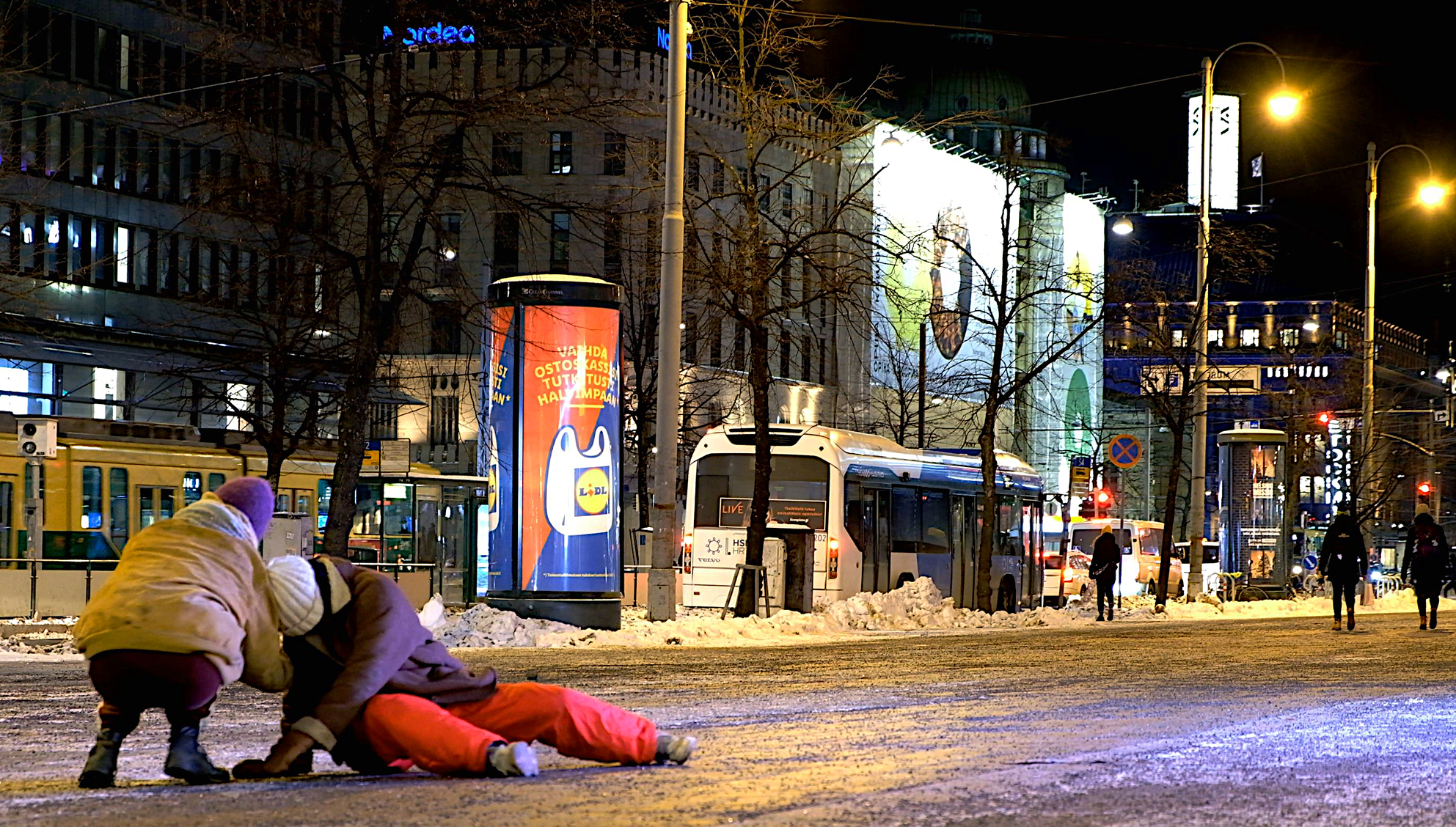 Tässä tutkimuksessa olen sukeltanut pää edellä tunteita herättäviin kysymyksiin tanssin ja kosketuksen merkityksellisyydestä ihmisolennolle nykyhetkessä. Tutkimuksen lähtökohtana on kosketuksen ja tanssin ehdottaminen julkiseen tilaan, osaksi maisemaa. Olen pyrkinyt havainnoimaan, millaisia muutoksia ja värinöitä tanssi aiheuttaa julkisissa tiloissa sekä kuinka oma kokemus tilasta muovautuu tanssin kautta. Koen, että julkisissa tiloissa tapahtuva oleminen/liikkuminen pyrkii häivyttämään ihmiskehoa, kutistamaan sen monimuotoista potentiaalia. Näissä tiloissa normien mukainen oleilu tarkoittaa hyvin pystysuoraa oleilua; seisomista, kävelemistä tai istumista. On ollut kiintoisaa tarkkailla, millaisia muutoksia ympäristössämme tapahtuu, kun tilaan asettuu toisin toimivia kehoja. Vain poikkeamalla vertikaaliakselilta tanssiva ruumis jo ravistelee tilaa. Tunnen alakuloisuutta havaitessani, kuinka vähän tanssitaide nauttii arvostusta, tai miten vaikeaa on jatkuvasti perustella omaa ammattiaan kanssakulkijoille. Huomaan toimivani marginaalin marginaalissa, periferiassa. Haluaisin kovasti tanssin ja erilaisten kehollisuuksien tunkeutuvan yhteiskuntaamme luontevammaksi osaksi arkeamme ja käsityksiämme ihmisyydestä. Kollegani ja ystäväni Kalle Lähde muotoili tanssin merkityksellisyyden mielestäni kovin kauniisti sanoessaan, että liikkumisen yksipuolistuessa ja kulttuurimme kulkiessa yhä kauemmaksi kehosta, on äärimmäisen tärkeää, että tanssivat kehot tuottavat maailmaan erilaisia kehollisuuksia ja tapoja liikkua. Hänen sanojensa mukaan tanssi on ikään kuin kehollisuuden museo.4 Meidän on näitä kehoja katsellessamme, kuunnellessamme ja aistiessamme mahdollista havaita oma monimuotoisuutemme ja ihmeellisyytemme. Tanssi on toisin toimimista tässä kutistuvassa maailmassa.