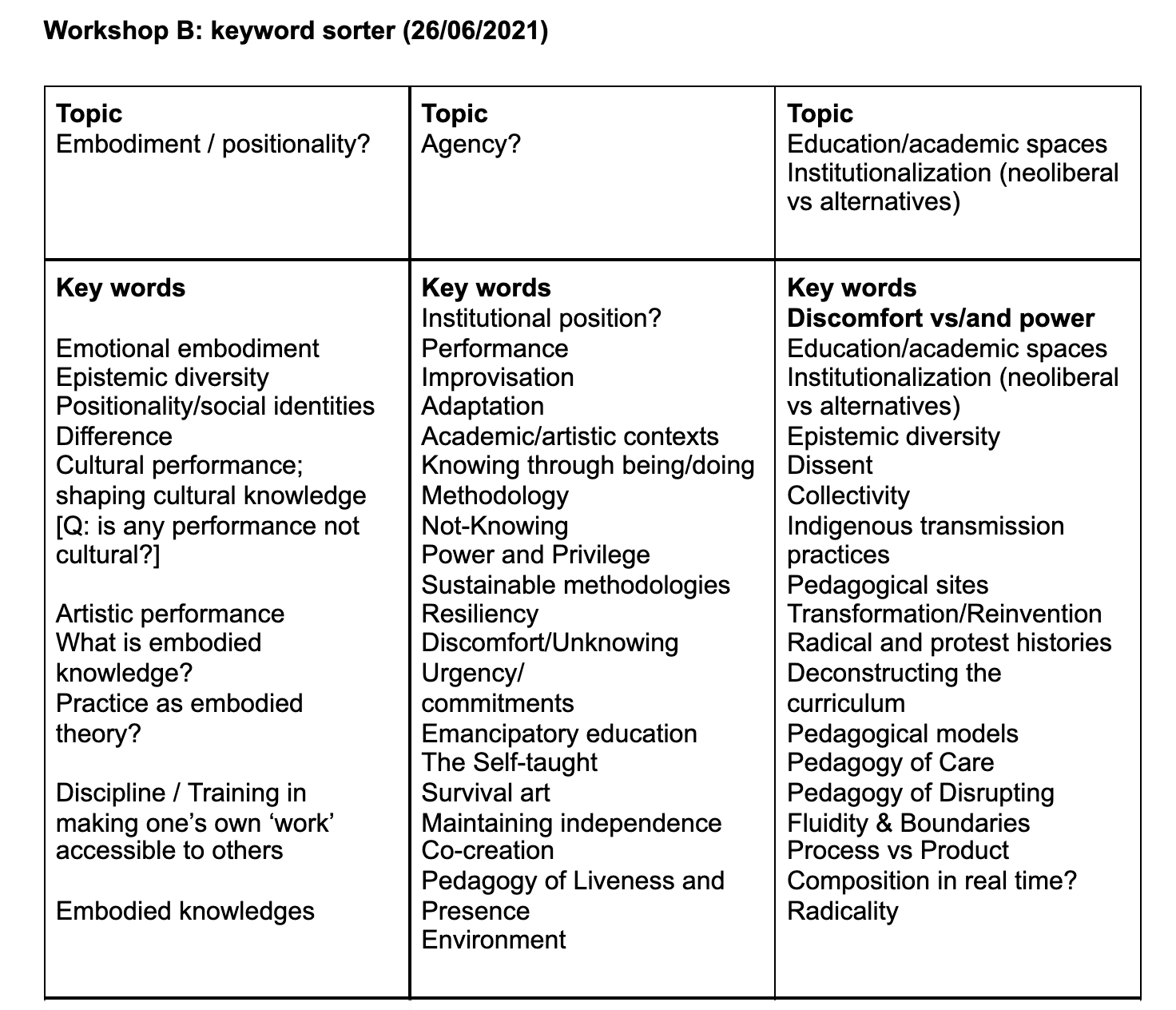Here is the video recording of Workshop B1 where participants share their one-on-one and two-on-two discussion topics with the group. Participants used the terms and ideas to populate a collaborative Google document used as a word sorter to then organize these collective ideas into three groups in preparation for Workshop B2.