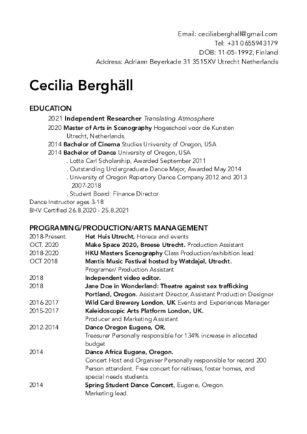 2020 Master of Arts in Scenography Hogeschool voor de Kunsten Utrecht, Netherlands.