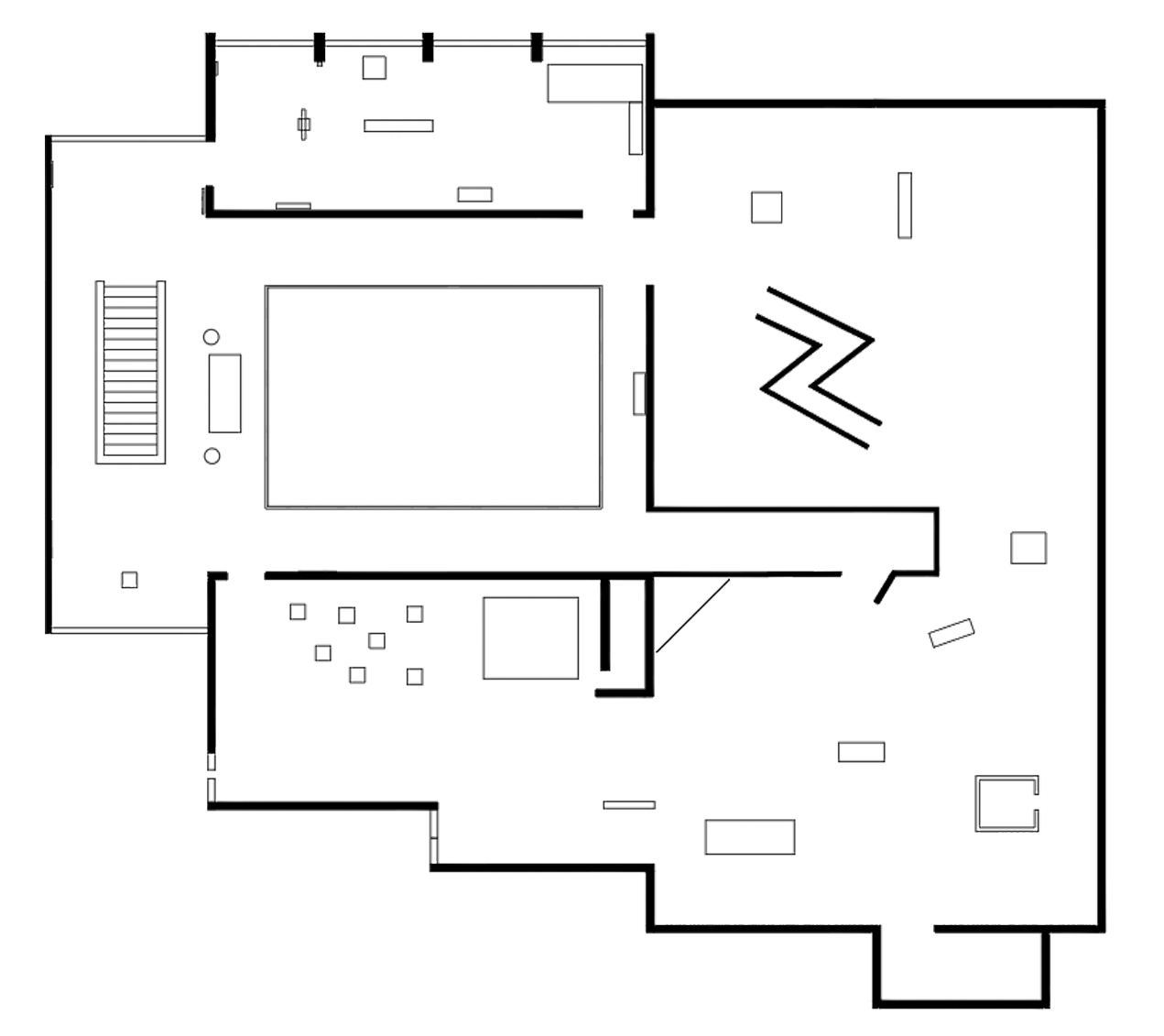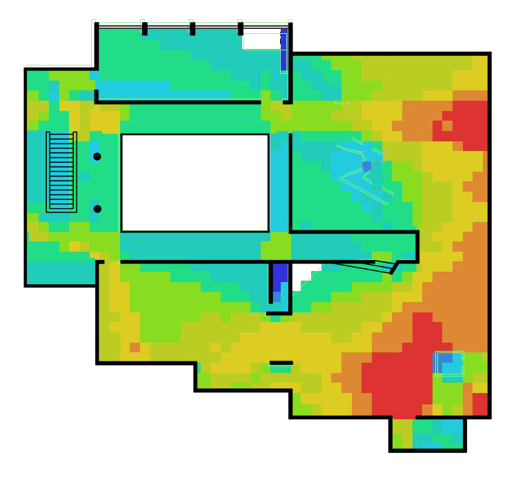 Thus, the case of the architecture of the exhibition “Head with Many Thoughts”, the behavioral pattern provided by Space Syntax is examined (Fig. Algorithmic integration map). This diagram shows which areas of space will be more integrated with respect to all other exhibition spaces (marked in red) and which the least (marked in blue). It can be observed that the algorithm predicts that the works of art of M. Savosalmi and V. Puidokas, V. Gečas, I. Tarajeva should best integrated into the human experience. In other words, this diagram shows the predicted image of human spatial anticipation.