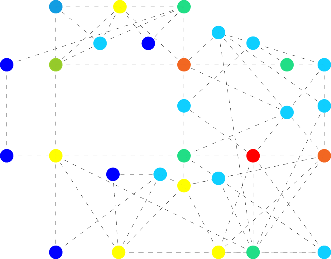 This assumption can be verified on the basis of data collected from the 25th Space Frame experiment. During the creative workshops, participants were asked to perform certain tasks and record movement, visual, audio, and tactile information. These data were marked in the exhibition plan. With this material, it is possible to notice in which places of the exhibition space the participants were most concentrated, in which places certain senses were mostly active. From these data, an analogous Space Syntax diagram is reproduced (Fig. Biological integration map), which this time it represents the actual, multimodal experience of the experiment participants. It can be noticed that the human experience is structured differently than predicted by the algorithmic anticipation diagram. Here it can be assumed that such a biological experience arises from the fact that the participants' behavior is based not on the actual spatial structure (Fig. Factual plan of the space), but also on the anticipatory image - the projection of space that a person constructs from a personal relationship with the environment and construction of consciousness.