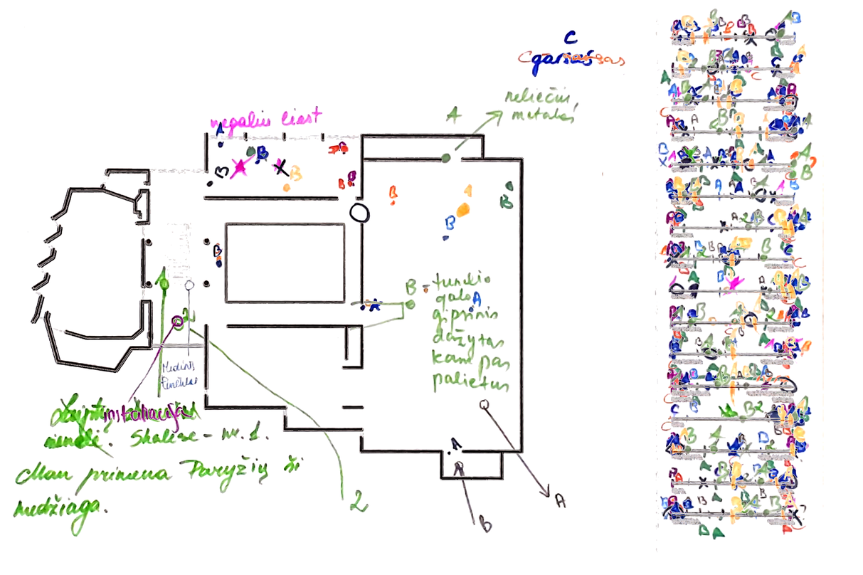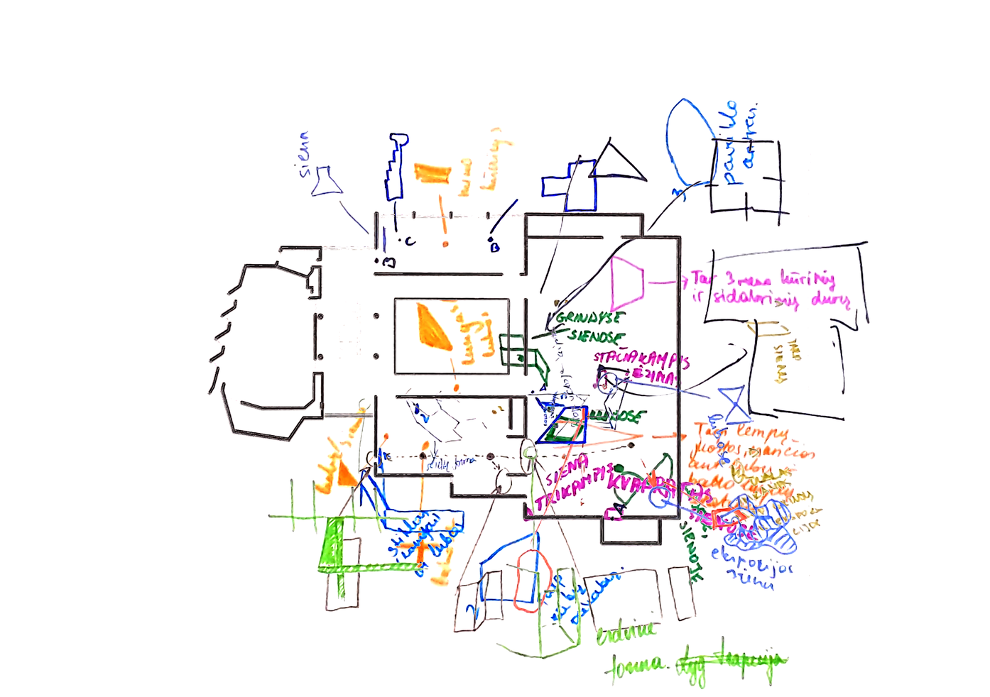 There was set a rule to move only straight. While participants were moving straight, they were observing a chosen place of the space or objects. It was significant to extend casual seeing habits. Therefore, participants were introduced to some techniques: peripheral observation while moving and focusing to a stable/steady point, de/unfocused observation, etc. All the observed data and the network of movement were marked on a plan of the CAC.