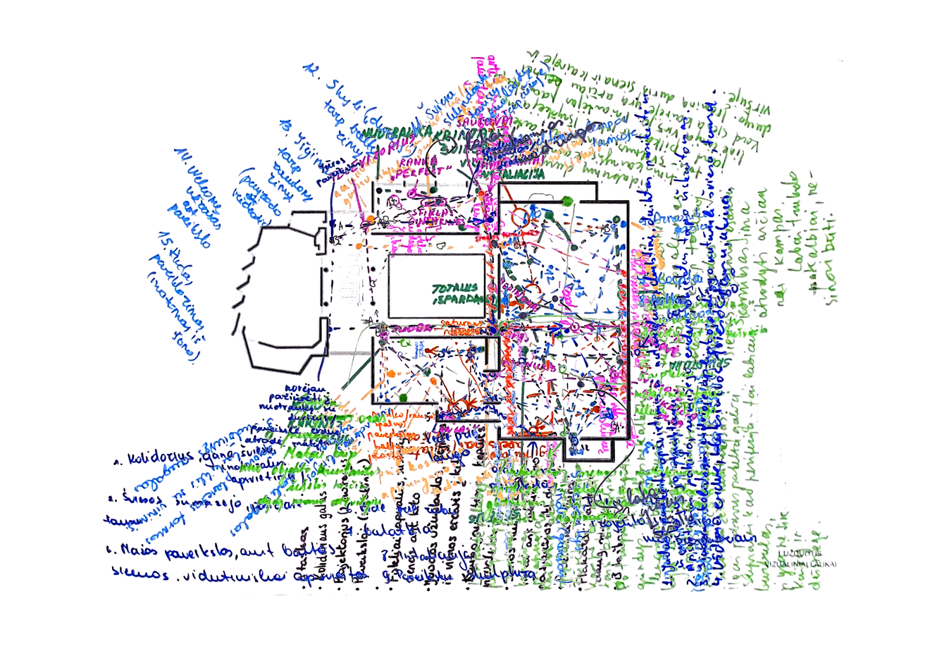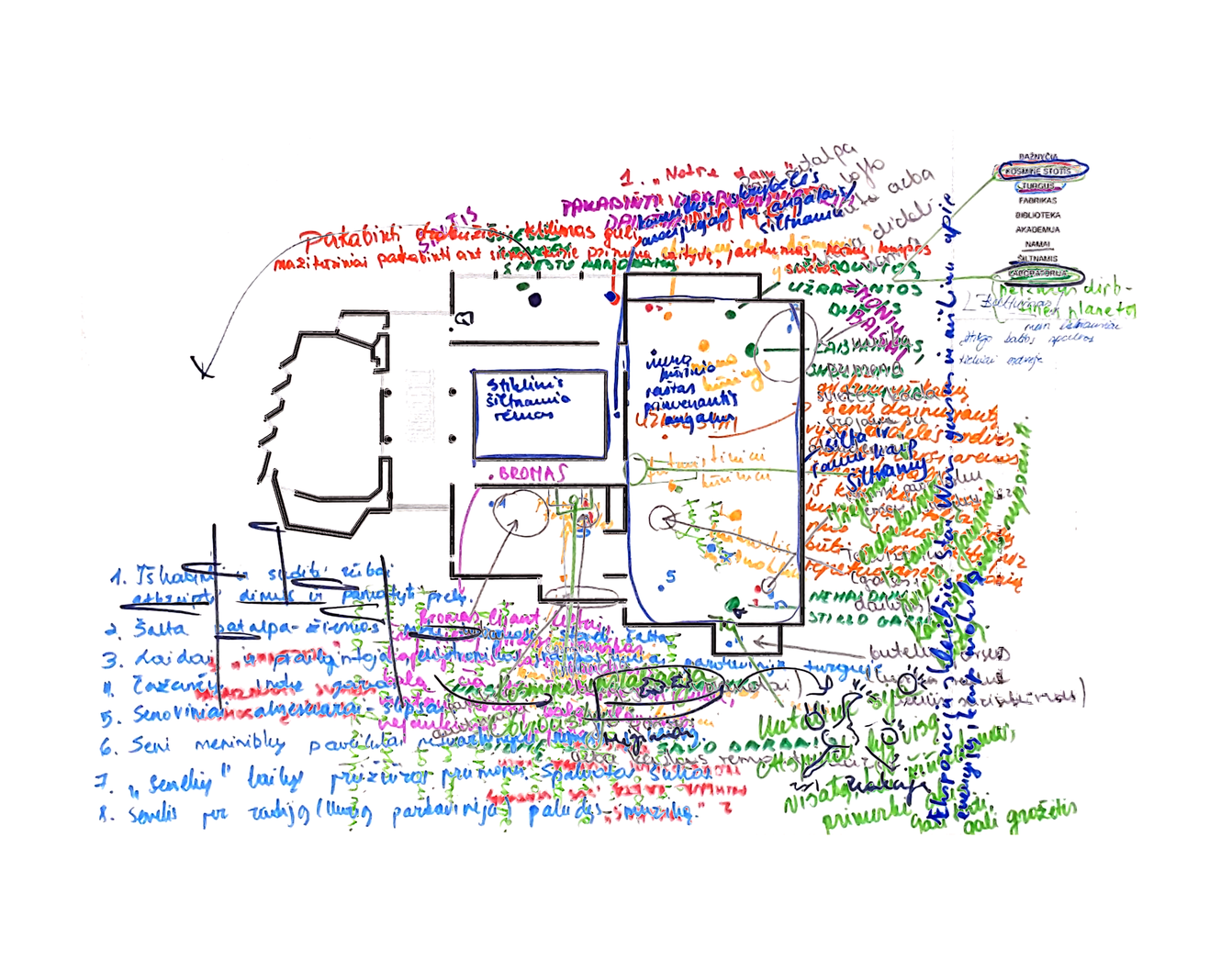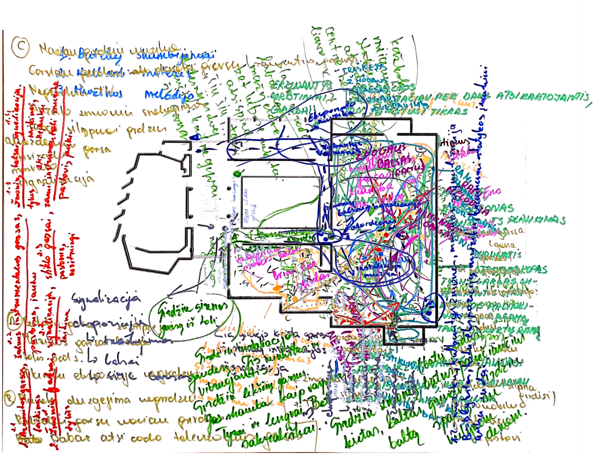 Participants were asked to repeat the same route and choose an intermediate point where it was required to listen to the sound around. Again a few techniques were introduced how to listen. Participants marked on a plan what specifics of the sounds are: which materials or friction of the materials create the sound, and if it is a constant or short-term sound, a high or low sound, what emotions it causes. In the second part of the task it was significant to mark how many sounds they hear from the standing point, and from which direction it comes. In the third part participants were asked to walk around and mark a territory of all the sounds they hear from the standing point. For instance, you hear three sounds: two different TV and some noise of the artistic installation. So, you need to understand a territory where you still hear all these sounds and where one of the sounds starts to disappear. When you observe that there is an invisible boundary of the sound room, then you mark it on the plan.