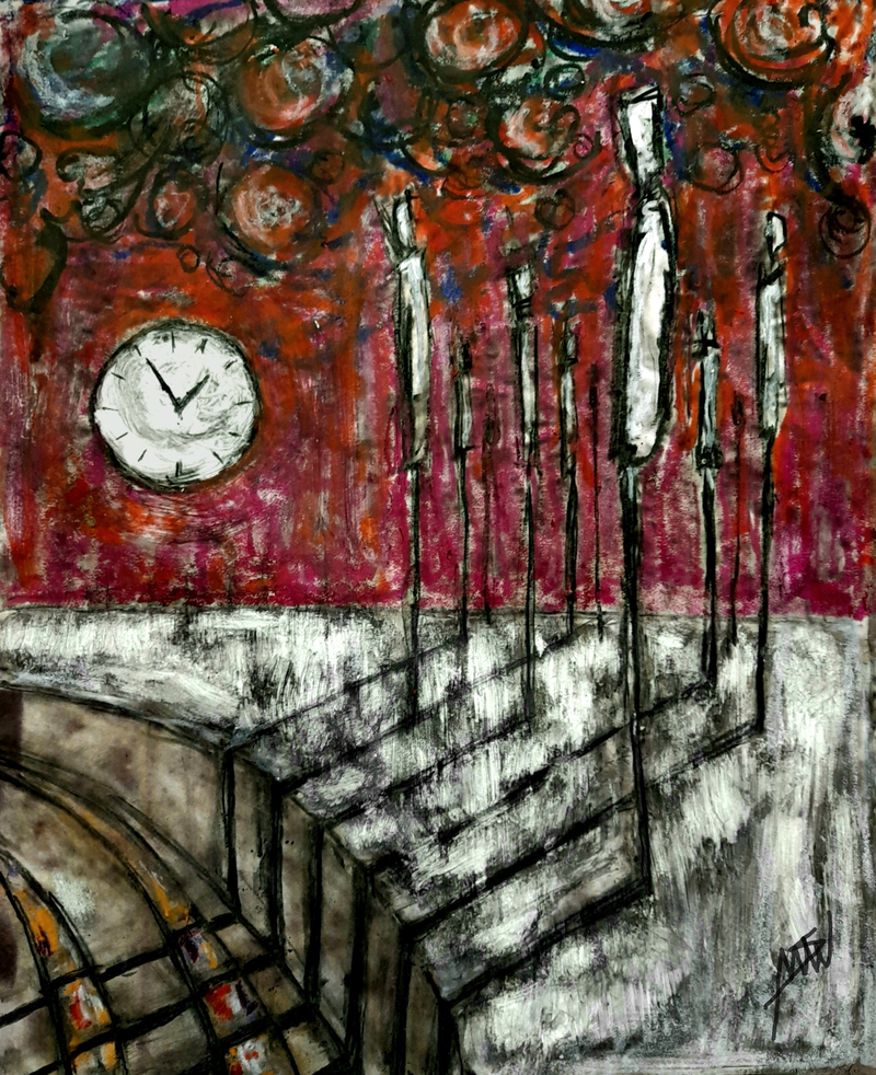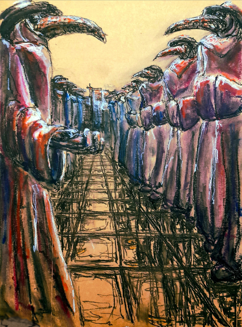 At the train station. You wait, watching the travellers passing by. Invisible strings pulling them, faceless, to a thousand destinations. You cannot identify. Uncomforted by the masks they wear, the distance they keep. And even more if they don’t. In cycles of unstructured chaos, movement converges: they, pillars, cast distorted shadows on the ground, which grow by the minute. Upon a whistle: they, crows, start crowding, swarming. A notion of estrangement falls upon you, distancing you from them, humans?