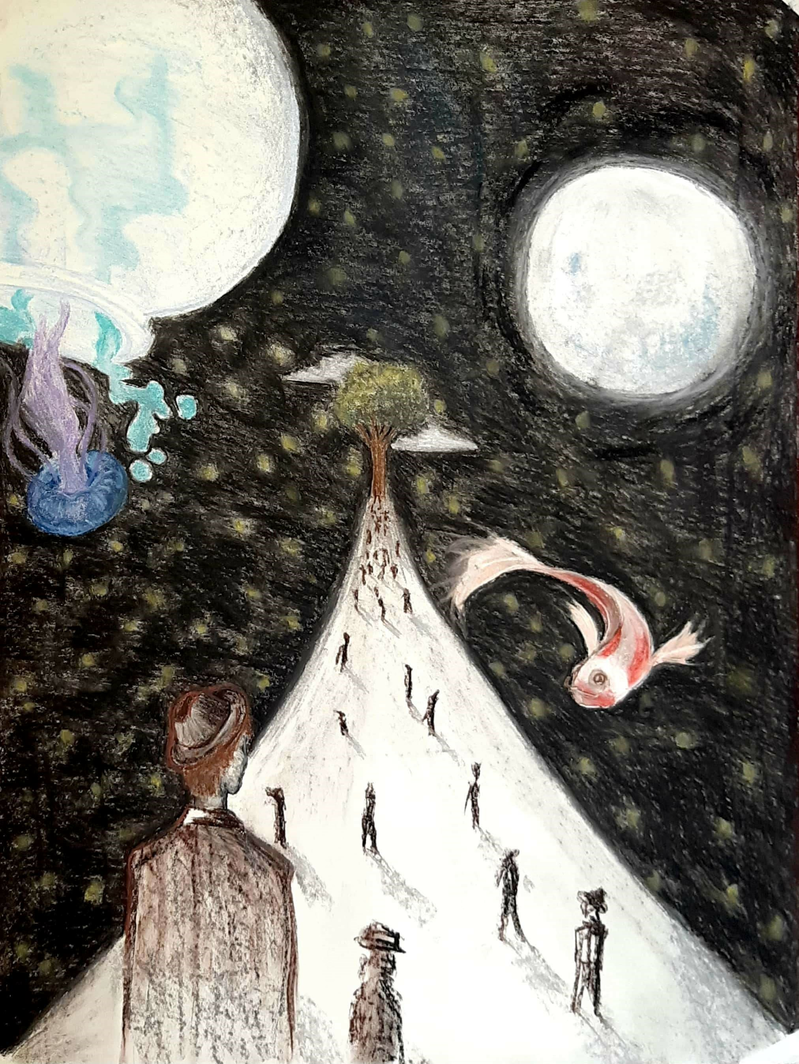 The world tree is a motif from Indo-European, Siberian, and Native American cultures which connects the heavens, the earth, and the underworld. It connects life and death. The journey to this tree is different for everybody, and this causes loneliness. Loneliness is also the feeling of being alone in your thoughts. Your head is actually your whole universe, and you set the limits. Joseph Conrad also addressed this concept: “It is impossible to convey the life-sensation of any given epoch of one’s existence—that which makes its truth, its meaning—its subtle and penetrating essence. It is impossible. We live, as we dream—alone....”.