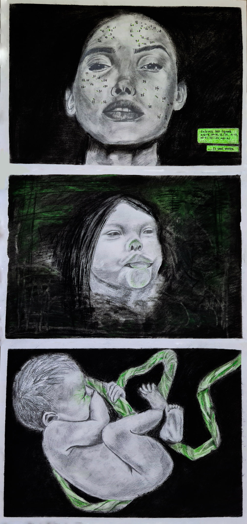 These drawings reflect the way some population groups felt lonely involved during the pandemic. When the urge to feel involved has not been fed, it is inevitable to feel lonely. Last year was filled with moments like these. People were left behind in times where they needed the most support. The blackened drawings present the numbered and fated students, the beloved 2020 newborns and the kids who will not reach their dreams while swimming their way in this world. The grey drawing presents the collusion between my mom and I, which has magnified, partly thanks to COVID.