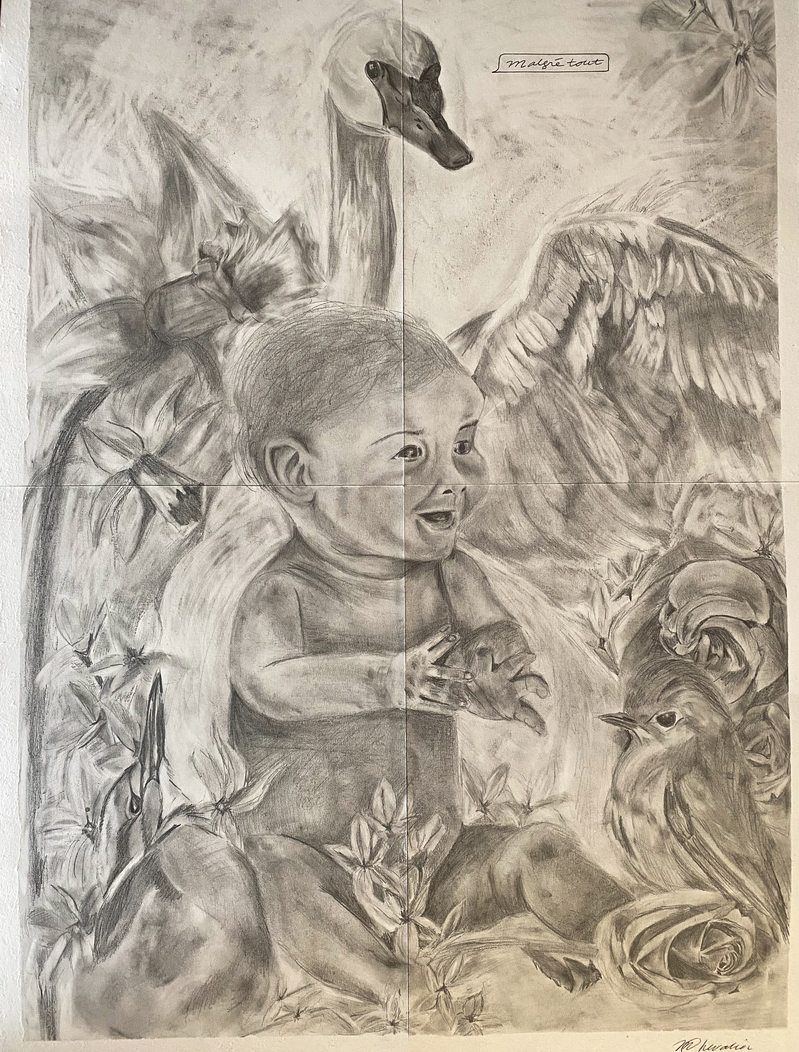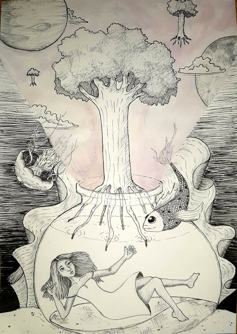 These drawings reflect the way some population groups felt lonely involved during the pandemic. When the urge to feel involved has not been fed, it is inevitable to feel lonely. Last year was filled with moments like these. People were left behind in times where they needed the most support. The blackened drawings present the numbered and fated students, the beloved 2020 newborns and the kids who will not reach their dreams while swimming their way in this world. The grey drawing presents the collusion between my mom and I, which has magnified, partly thanks to COVID.